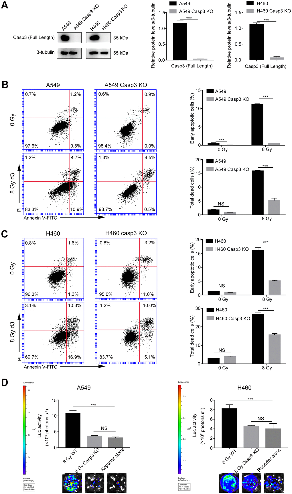 We have previously reported a critical function of caspase-3 in breast and melanoma tumor cell repopulation [10, 20]. In the present study, we investigated whether caspase-3 exerted a growth-promoting effect of dying NSCLC cells. Using CRISPR/Cas9 technology, we generated A549 and H460 cells with genetic ablation of caspase-3 (Casp3 KO cells). First, we performed immunoblotting assays to assess the efficiency of Casp3 KO cells in different mutant single-cell clones (data not shown) and subsequently selected a clone with a sufficient Casp3 KO effect. As shown in Figure 2A, compared with the control A549 or H460 cells (wild-type), the levels of caspase-3 were reduced in selected Casp3 KO clones. Furthermore, we found that compared with the control group, the percentage of early apoptotic cells and total dead cells decreased in both 8 Gy-irradiated A549/Casp3 KO and H460/Casp3 KO groups on day 3 (Figure 2B, 2C). Using the in vitro repopulation model, we observed that 8 Gy-irradiated Casp3 KO feeder cells diminished the growth-stimulating effect of caspase-3 on both A549 and H460 living reporter cells (Figure 2D).