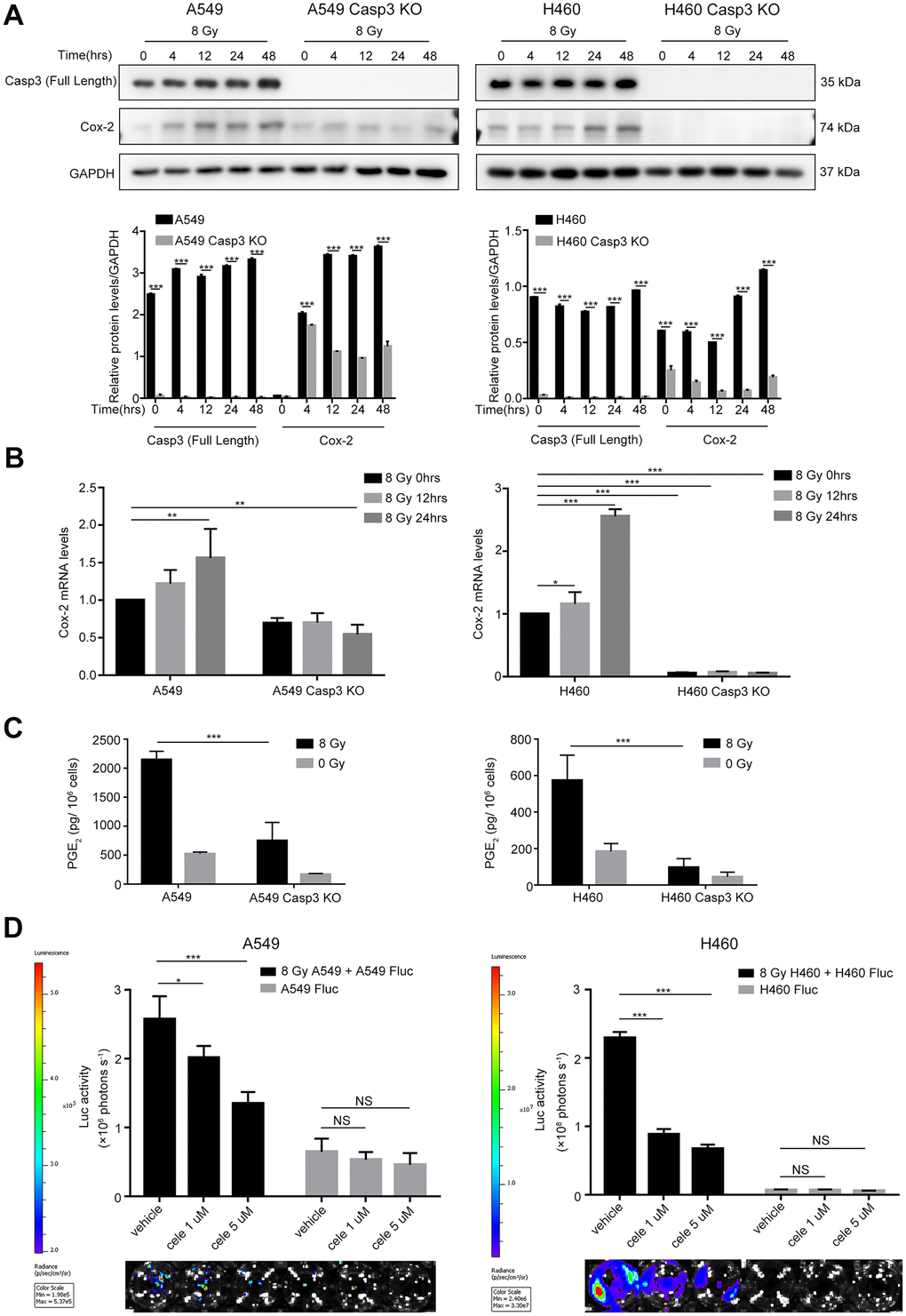 Because Cox-2 is involved in the production of bioactive lipid PGE2, and we previously identified PGE2 as a downstream effector of caspase-3 in tissue regeneration [21], angiogenesis [11], and breast tumor repopulation [10], we hypothesized that caspase-3 could promote PGE2 production by increasing Cox-2 expression in dying NSCLC cells. Western blotting and quantitative real-time polymerase chain reaction (qPCR) showed elevated expression and transcription of Cox-2 in both A549 and H460 cells after exposure to 8 Gy radiations in a time-dependent manner (Figure 3A, 3B). However, the expression and transcription of Cox-2 were markedly inhibited in Casp3 KO cells following 8 Gy irradiation (Figure 3A, 3B). We next analyzed the production of PGE2 in supernatants obtained from irradiated A549 and A549/Casp3 KO cells using enzyme-linked immunosorbent assay (ELISA). As shown in Figure 3C, the levels of PGE2 in 8 Gy-irradiated A549 cells on day 2 increased approximately fourfold as compared with those in non-irradiated A549 cells. However, the secretion of PGE2 was considerably lower in Casp3 KO cells with or without 8 Gy irradiation. Moreover, similar results were obtained in H460 and H460/Casp3 KO cells. To determine the function of PGE2 in regulating the growth-stimulating effect of dying NSCLC cells in vitro, we next studied whether the growth of living NSCLC cells was inhibited with the downregulation of Cox-2. Treatment with celecoxib (1 μM or 5 μM), a selective Cox-2 inhibitor, dramatically decreased the growth-stimulating effect of dying A549 or H460 feeder cells on A549 Fluc or H460 Fluc reporter cells in a dose-dependent manner (Figure 3D). In summary, these results demonstrate that PGE2 is involved in caspase-3-induced NSCLC cell repopulation after irradiation.