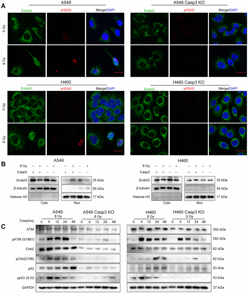 Because DNA damage inducers, such as radiations, trigger apoptosis, the finding that apoptotic caspase-3 reversely promoted DSBs following irradiation in NSCLC cells was surprising [43]. The results of our study revealed a novel function of activated caspase-3, i.e., activation of DDR by promoting nuclear translocation of EndoG following irradiation. Our results are consistent with those of other studies. For instance, Liu et al. reported that a moderate radiation dose (≤ 6 Gy) sublethally activated caspase-3, causing DNA damage [44]. Similarly, Liu et al. found that activation of caspase-3 and nucleases resulted from spontaneous cytochrome C leakage, causing DNA damage and ATM activation, and leading to cancer stemness and tumorigenicity [13]. Another study reported that lethally activated caspase-3, in etoposide- or tumor necrosis factor (TNF)α-treated Hela cells, cleaved Cdc6 at D290/S and D442/G sites to activate ATM/ATR kinase and apoptosis [45]. Our findings demonstrated that lethally activated caspase-3 induced DDR following irradiation in an ATM/p53 pathway-dependent manner in NSCLC.