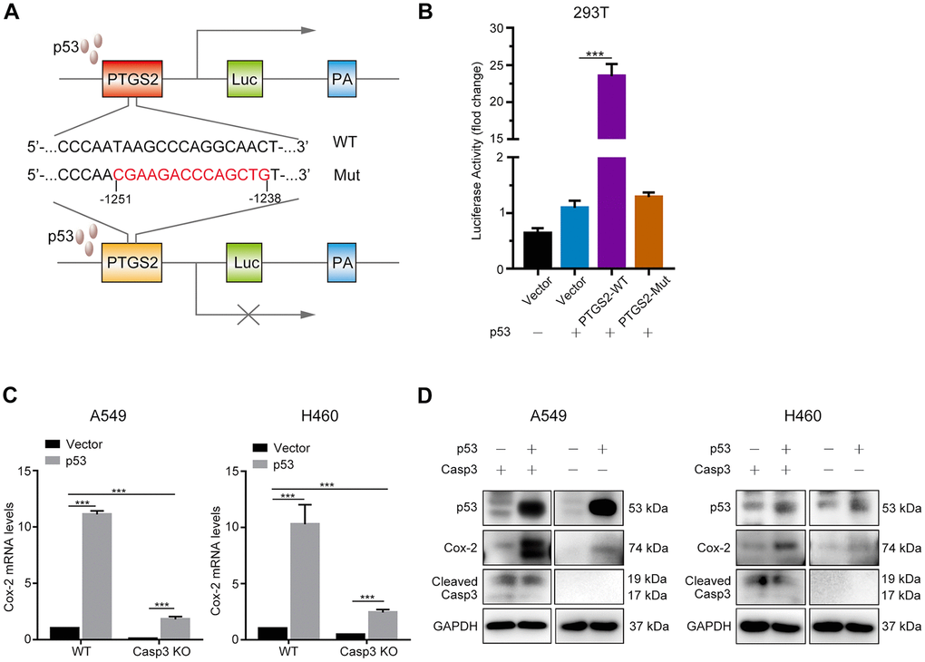 It was previously demonstrated that the tumor suppressor p53 induced the expression of Cox-2 in response to DNA damage [24]. To elucidate whether p53 regulated the transcription of the PTGS2 gene (encodes Cox-2), we first searched the JASPAR database (http://jaspar.genereg.net) to predict p53 binding sites in the PTGS2 promoter (Supplementary Figure 3). Next, we constructed a luciferase reporter plasmid encoding the PTGS2 promoter sequence (PTGS2-WT) or mutant sequence (PTGS2-Mut) in a region between −1251 bp and −1238 bp (Figure 5A). As shown in Figure 5B, p53-overexpressing cells exhibited higher luciferase activity in the PTGS2-WT group than in the control group. However, in the PTGS2-Mut group, the overexpression of p53 did not result in a major difference as compared with the controls. Next, we examined the transcript levels of Cox-2 following the overexpression of p53. As shown in Figure 5C, 24 h after transfection in A549 and H460 cells, the levels of Cox-2 transcript increased by more than 10-fold. We found a markedly less p53-induced expression of Cox-2 in Casp3 KO cell lines (Figure 5C). Further, western blotting results showed that the expression of Cox-2 in p53-overexpressing A549 and H460 cells was considerably higher than in p53-overexpressing Casp3 KO cells (Figure 5D). Based on these results, we conclude that p53, as a transcription factor, activates the expression of PTGS2 in NSCLC.