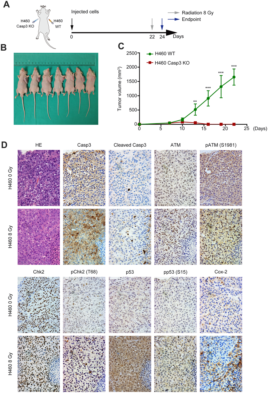 Caspase-3 knockout decreases tumorigenicity, and radiations activate the ATM/p53/Cox-2 axis in vivo
