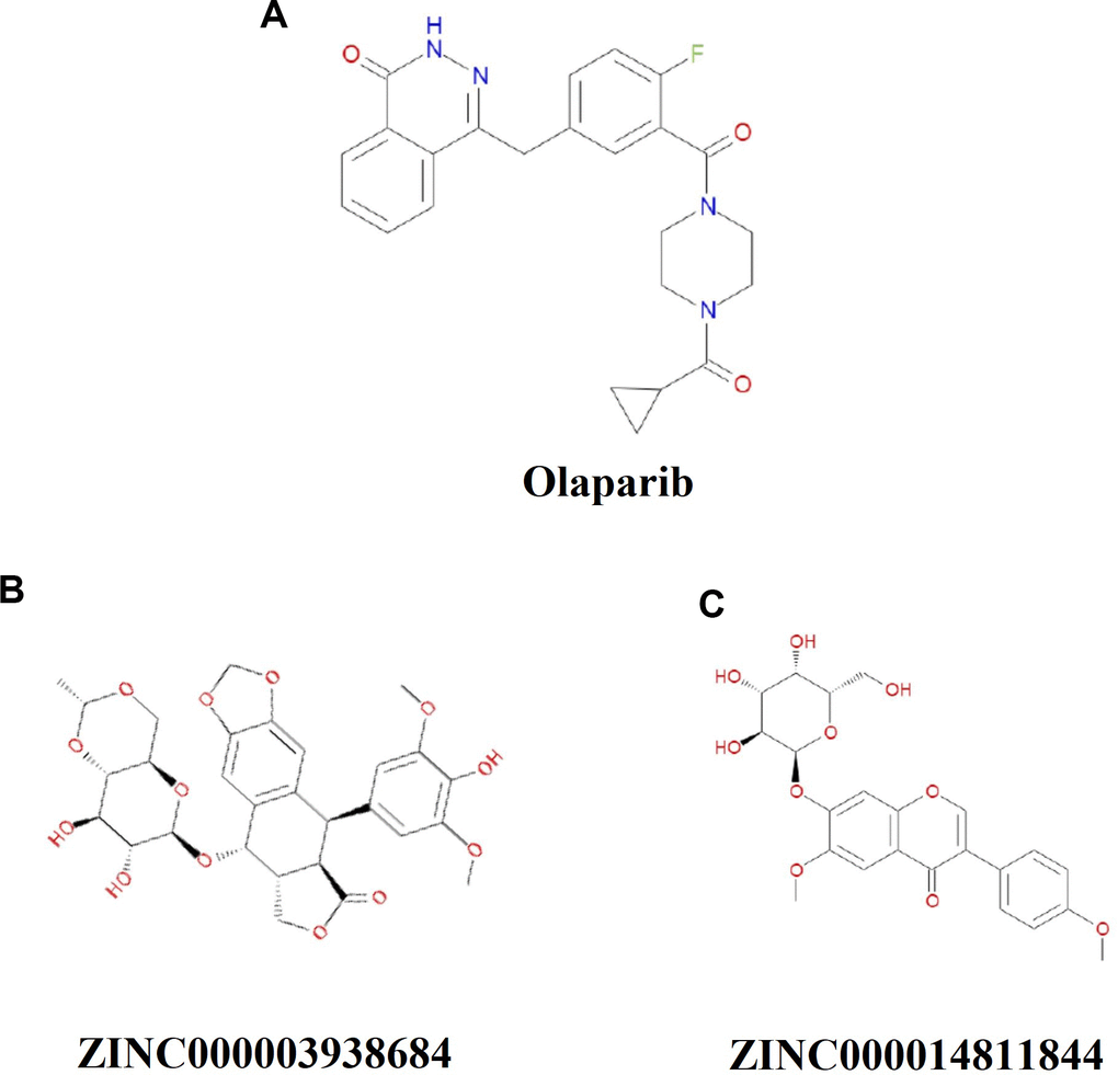 The ligand-binding pocket played an important part in the regulatory sites of PARP. Therefore, this pocket region was chosen as the reference site. A total of 17931 ligands were screened from the ZINC15 database, which was marked as for-sale, biogenic and named. Select the chemical structure of PARP as the receptor to contrast the pharmacologic properties between it and other compounds. Among these, 3461 compounds had higher scores than Olaparib and the compounds which scored in the top 20 were listed in Table 1.