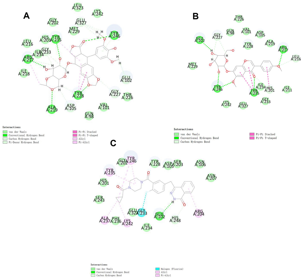 To study ligand blinding mechanisms of these compounds with 2RCW. ZINC000003938684 and ZINC000014811844 were docked into the molecule structure of 2RCW by CDOCKER module, and CDOCKER potential energy was calculated and displayed as shown in Table 4. The CDOCKER potential energy of ZINC000003938684 and ZINC000014811844 were significantly lower than the reference ligand Olaparib in the Table 4, which illustrated that 2RCW may have a higher binding affinity with ZINC000003938684 and ZINC000014811844 than Olaparib. Hydrogen bonds and π-related interactions were also performed through a structural computation study (Figures 2 and 3). Results showed that ZINC000014811844 formed 10 pairs of hydrogen bonds with 2RCW, by the O2 of the compound with ARG217:HN of 2RCW, O2 of the compound with LEU216:HA of 2RCW, O31 of the compound with TYR235:HN of 2RCW, O24 of the compound with TYR246:HH of 2RCW, O26 of the compound with TYR246:HH of 2RCW, O31 of the compound with HIS201:HE1 of 2RCW, et al. (Table 5). Also, 3 pairs of π-related interactions were formed in the complex. ZINC000003938684 formed 5 pairs of π-related interactions with 2RCW, by 2 pairs of TYR228 of 2RCW with compound, 1 pair of TYR235 of 2RCW with compound, 1 pair of TYR228 of 2RCW with compound, and 1 pair of ARG227 of 2RCW with compound (Table 6). It also formed 17 hydrogen bonds with 2RCW. As for reference Olaparib, there are 2 hydrogen bonds with 2RCW and 6 π-related interactions with 2RCW.