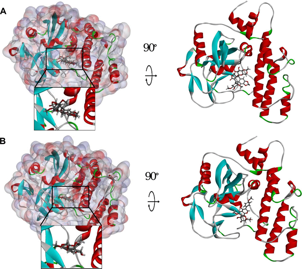 Safety ought to be greatly considered during the study. To ensure the safety of these 20 compounds, various types of toxicity indexes of the compounds and Olaparib, such as developmental toxicity potential properties, rodent carcinogenicity (based on the U.S. National Toxicology Program dataset), as well as Ames mutagenicity were predicted by using a computational method in the TOPKAT module (Table 3). Consequence illustrated 10 compounds were found to be non-mutagenic, and 3 compounds were found with no developmental toxicity potential. It is predicted that Olaparib had higher rodent carcinogenicity both in mouse and rat. In consideration of all the above results, ZINC000003938684 and ZINC000014811844 were determined to be the perfect lead compounds with non-CYP2D6 inhibitors, thus without hepatotoxicity, together with less Ames mutagenicity, developmental toxicity potential and rodent carcinogenicity in comparison with other compounds. To sum up, ZINC000003938684 and ZINC000014811844 were regarded as safe drugs and chosen for the following study (Figure 1).
