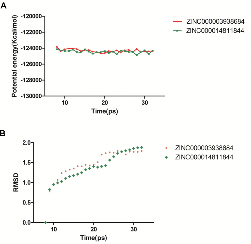 Finally, their stabilities in the natural environment were investigated by molecular dynamics simulation. Calculation of RMSD and potential energy of these ligand-2RCW complexes demonstrated the trajectories of complexes reached equilibrium after 30 ps. With time going by, RMSD and potential energy of these complexes got stabilized gradually, which showed ZINC000003938684 and ZINC000014811844 could interact with 2RCW and the complexes were stable in the natural environment. On account of the results, these 2 compounds could be used for drug development and refinement.