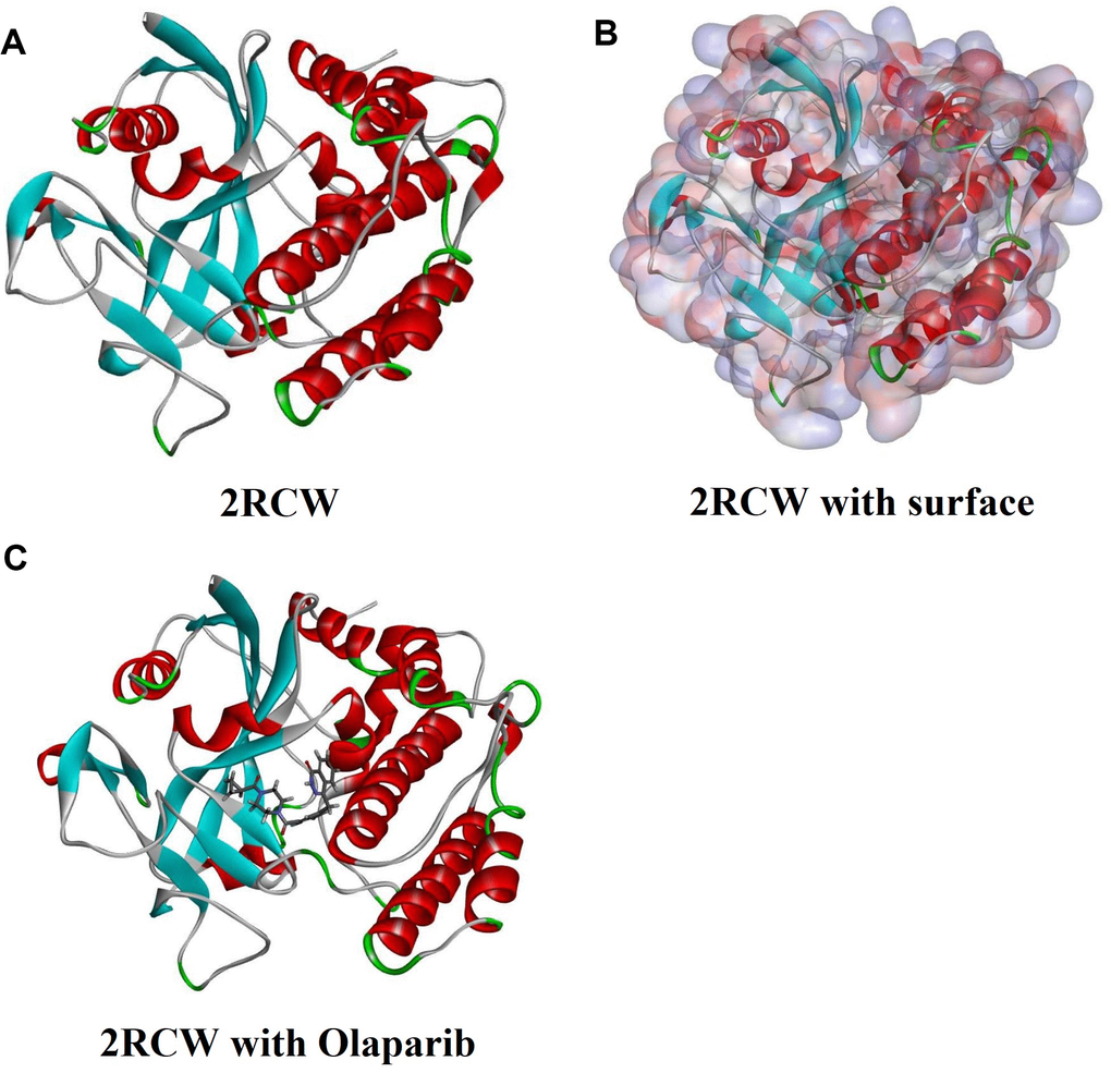 In this study, LibDock, ADME, TOPKAT, CDOCKER and Molecular Dynamics Simulation, five sections of Discovery Studio were used for virtual screening and analysis. As a result, 17931 biogenic-for sale-named ligands were screened from the ZINC15 database for virtual screening. Compared with other compounds, compounds with a high LibDock score showed better energy optimization and a stable conformation. After the calculation of modules, 7894 compounds were found to be eligible to bind stably with 2RCW than Olaparib. The top 20 compounds were selected and pooled for further study based on the LibDock score.