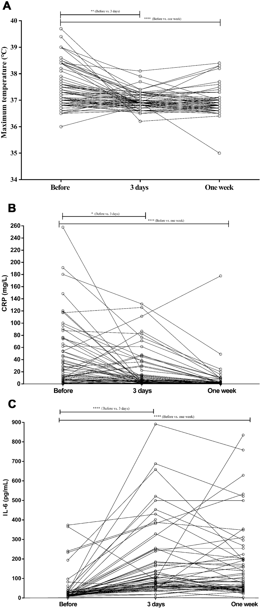 Three days after tocilizumab treatment, the body temperature of most patients had dropped, gradually moving closer to the normal range (Figure 1A). Simultaneously, the clinical symptoms were greatly attenuated over the following days. Figure 1B shows that 1 week after tocilizumab treatment, the CRP levels had decreased significantly in all but one patient. In that patient, who was critical, CRP levels greatly increased, and the patient died after 27 days in the hospital. Intriguingly, IL-6 levels increased significantly in tocilizumab-treated patients, though their condition was significantly improved (Figure 1C). No adverse drug reactions were reported during the tocilizumab treatment.