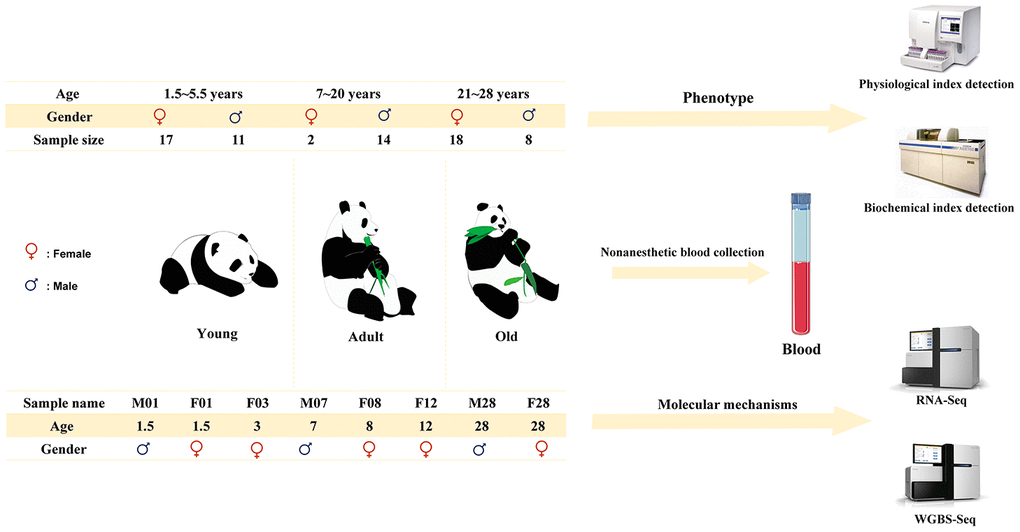 Thirty captive giant pandas aged 1–28 years were raised in China Conservation and Research Center for Giant Panda (Dujiangyan, China). These pandas were healthy (except for a few giant pandas with medical history) with typical spirit, appetite, and defecation patterns (Supplementary Table 8). During the period between 2017 and 2019, and 70 blood samples were collected as follows: 28 from the young group (1.5–5.5 years old), 16 from the adult group (7–20 years old), and 26 from the old group (21–28 years old). All samples were sent to Dujiangyan People’s Hospital for physiological and biochemical tests using the bc-5800 hematology analyzer (Mindray Technology Co., Ltd., China) and AU 2700 chemistry analyzer (Olympus, Japan), respectively.