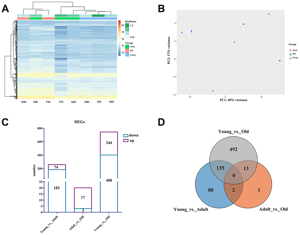 To identify of the DEGs between different ages, we constructed cDNA libraries derived from blood samples to obtain the normalized expression of each gene, using |log2FoldChange| > 1 and false discovery rate (FDR) <0.05 as the standard for screening DEGs. Eight cDNA libraries were constructed using total RNA from blood samples obtained from giant pandas, and a total of 657,404,608 reads were obtained. Reads from the samples covered an average of 89.80% (88.45%–90.86%) of the giant panda reference genome [16], and an average of 86.33% (84.0%–87.8%) of the reads were compared only once (Supplementary Table 2). We used the expression levels of all genes for principal component analysis (PCA) and clustering heat map analysis. As shown in Figure 2A, all samples from the young group and two samples from the adult group were clustered together, and one sample from the adult group and all samples from the old group were clustered into a separate cluster. PCA results showed that all samples in the young group were separated from the samples in the other groups, and the samples in the adult and old groups could not be distinguished effectively (Figure 2B). In total, we detected 257, 20, and 744 DEGs in the Young vs. Adult, Adult vs. Old, and Young vs. Old groups (Figure 2C). The Young vs. Adult and Young vs. Old groups had the highest proportion of overlapping DEGs, while the Young vs. Old group has the most unique DEGs (Figure 2D).
