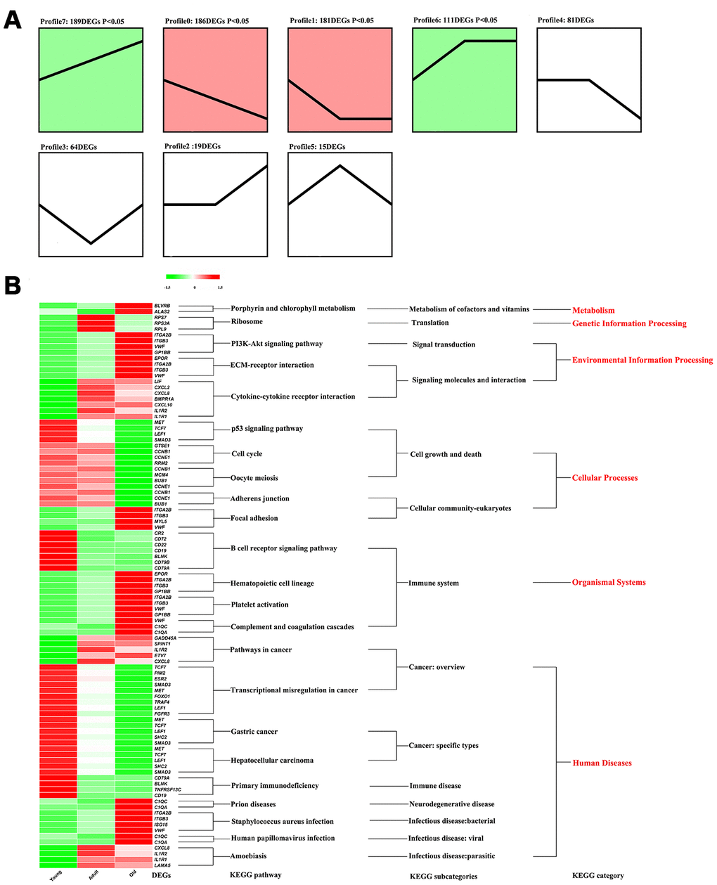 Clarification of the function of DEGs is of considerable significance in understanding the physiological changes that occur with age in giant pandas. The protein interaction network (PPI) constructed based on the DEGs showed that BUB1 (nodes = 26) and CCNB1 (nodes = 26) had the most nodes (Supplementary Figure 1). As shown in Figure 3A, all the DEGs were divided into eight profiles by STEM according to the transcripts per million (TPM) in the three stages. However, only Profile7, Profile0, Profile1, and Profile6 showed significantly enrichment (P < 0.05). Profile7 contained the largest number of DEGs; however, due to the scattered functions of the DEGs, no significant KEGG pathway was found to be enriched in Profile7 (Supplementary Table 3). As shown in Figure 3B, KEGG pathways associated with metabolism, genetic information processing, environmental information processing, cellular processes, organismal systems, and human disease categories were enriched by the DEGs in the different profiles. To be more specific, the porphyrin and chlorophyll metabolism pathways belonging to the metabolism category were significantly upregulated in old giant pandas. All the DEGs enriched in the environmental information category pathways showed the lowest expression in the young giant pandas, and the DEGs enriched in the PI3K-Akt signaling and ECM-receptor interaction pathways showed the highest expression in the old giant pandas. DEGs enriched in most pathways of the cellular processes category showed the highest expression in the old giant pandas, while the expression levels of DEGs in the focal adhesion pathway increased with age. All pathways in the category of organismal systems belonged to the immune system subcategories. The DEGs in the B cell receptor signaling pathway showed the highest expression levels in the young pandas, and the other immune system-related pathways were found to be activated in the old giant pandas. The largest number of KEGG pathways belonged to the human disease category, although the expression trends varied among the different disease pathways.