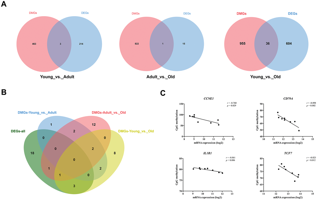 To determine whether DNA methylation is involved in the regulation of DEG expression, we first identified the intersection of DEGs and DMGs in each age group. As shown in Figure 4A, there were three, one, and 36 genes that were both differentially methylated and differentially expressed in the Young vs. Adult, Adult vs. Old, and Young vs. Old groups, respectively (Supplementary Table 7). Furthermore, we found that the KEGG pathways enriched by DMGs in each group overlapped with the KEGG pathways enriched by DEGs in all profiles (Figure 4B). In addition, 49 DEGs that were significantly enriched in the KEGG pathways were selected from each profile based on previous research. We obtained the expression levels, CpG methylation values in the promoter region and CpG methylation values for each of these DEGs. Then, we analyzed potential correlations between the expression and CpG methylation levels of the 49 DEGs. The expression levels of CCNE1, CD79A1, IL1R1, and TCF7 were highly correlated with the degree of CpG methylation. The expression of CCNE1 was negatively correlated with CpG methylation in the promoter region (r = -0.760). The expression of CD79A, IL1R1, and TCF7 was negatively correlated with CpG methylation in the gene body region. In the PPI network constructed for all DEGs, CCNE1, CD79A, IL1R1, and TCF7 all had more than five nodes, suggesting that these genes play an important role in the age-related changes in the entire genetic network.