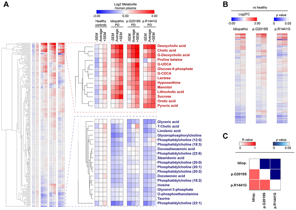 We performed mass spectrometric metabolomics of plasma from: i, patients with idiopathic PD; ii, PD patients with the p.G2019S or p.R1441G mutations of the LRRK2 gene (Figure 1A and Supplementary Table 1); and iii, from a PD mouse model (Supplementary Table 2). These mice were treated with the neurotoxin 6-OHDA, that triggers a rapid degeneration of midbrain dopaminergic neurons in the substantia nigra.