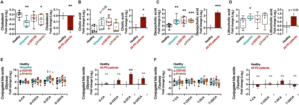 | Abbreviations: CA, cholic acid; DCA, deoxycholic acid; G, glycine; LCA, lithocholic acid; PD, Parkinson’s disease; T, taurine. Differences were considered statistically significant when p-value: *(p<0.05), **(p<0.01), ***(p<0.001), and n.s. = not significant (p>0.05). | |||||||||||||||||||||||||||||||||||||||||||||||||||||||||||||||||||||||||||||||||||||||||||||||||||