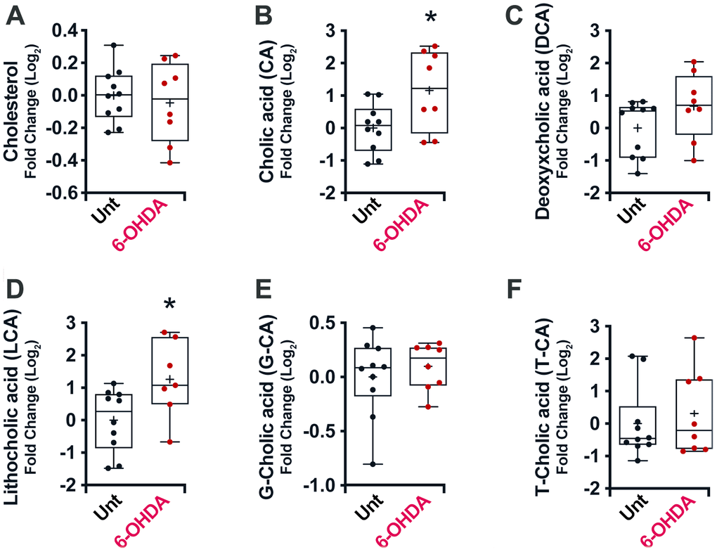 No significant differences in cholesterol plasma levels (Figure 3A) were noticed in mice treated with 6-OHDA. Conversely, a general increase in unconjugated bile acid levels was observed in the plasma of these mice (CA, p = 0.02; DCA, p = 0.14; LCA, p = 0.02) (Figure 3B–3D), with no significant differences in conjugated bile acids (Figure 3E, 3F), consistent with the results obtained in human PD.