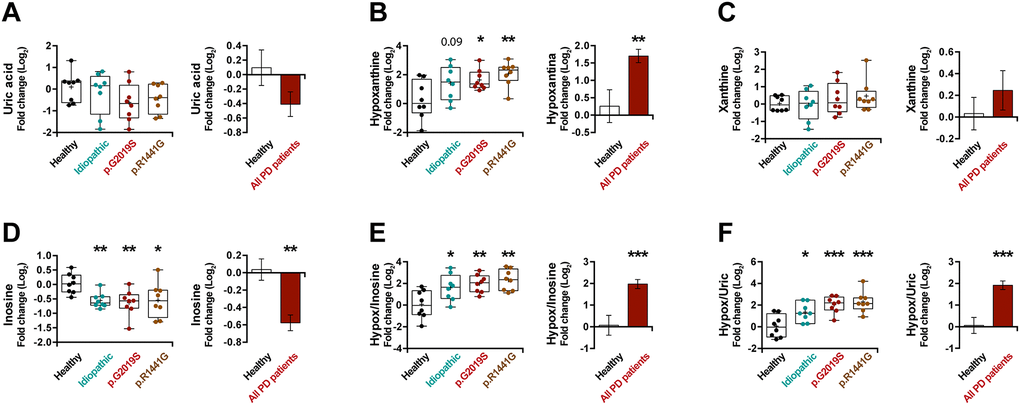 UA has been reported as a risk factor in PD [35]. Accordingly, we observed lower UA levels in the plasma of PD patients (Figure 4A) (p = 0.13), however, this decrease was not spectacular. As UA is the end product of the metabolism of exogenous- and endogenous-derived purines (Supplementary Figure 3A), we decided to analyze in depth the rest of the metabolites of the purine pathway. Interestingly, the hypoxanthine levels in patients with PD are much higher than in healthy individuals (Figure 4B) (p < 0.01), but no major changes in xanthine levels (Figure 4C) were observed in these patients. In addition, analyzing the levels of a precursor of hypoxanthine, we can see a decrease in the levels of inosine (Figure 4D) (p < 0.001). On the same line, we noticed a very significant increase in PD patients in the ratios between hypoxanthine and its precursor (hypoxanthine/inosine ratio) (Figure 4E) (p < 0.001) or its product (hypoxanthine/UA ratio) (Figure 4F) (p < 0.001), confirming the accumulation of hypoxanthine. In summary, we observed an increase in hypoxanthine levels and a decrease in both its product and its precursor, suggesting a blockade of this metabolic cascade.
