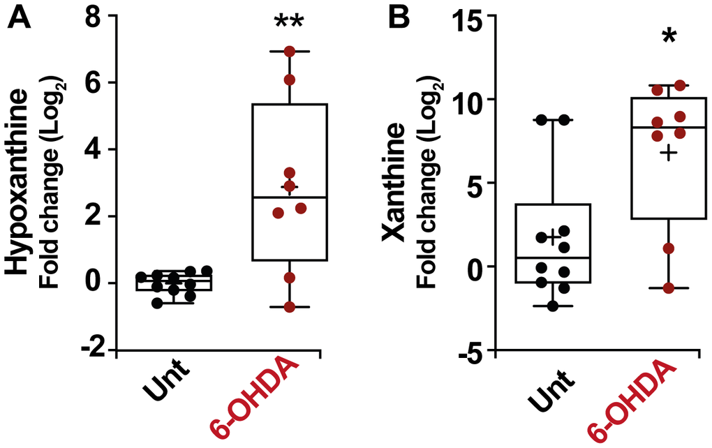 As in the previous section, in order to verify these results, we also analyzed the modulation of the purine pathways in the murine PD model. Remarkably, an increase in the level of hypoxanthine was also observed in the serum of mice treated with 6-OHDA (Figure 5A) (p < 0.01) similarly to the result obtained in patients. In this model, the change in hypoxanthine level was accompanied by an increase in xanthine levels as well (Figure 5B) (p < 0.05). All these results together point to the robustness of the PD-associated increase in hypoxanthine.