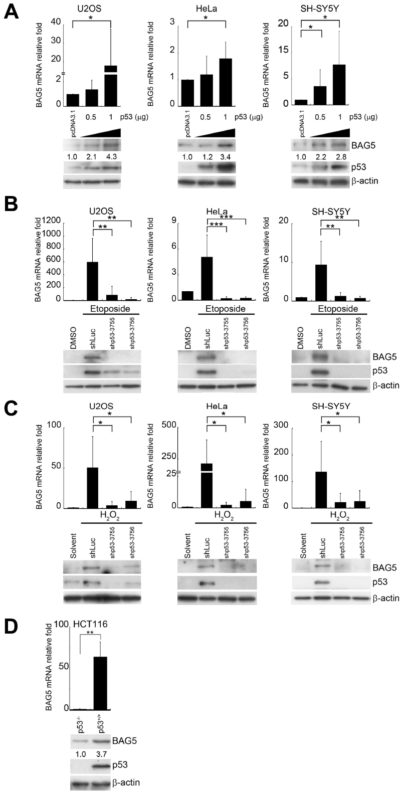 p53 activation plays a central role in response to a range of cellular responses [25]. p53 expression and Ser15 phosphorylation under etoposide or H2O2 treatment (Figure 1A, 1B) suggest that p53 was transactivated under these stresses. To investigate whether p53 regulates BAG5 expression, we evaluated BAG5 expression levels in the presence of different amounts of p53 in U2OS, HeLa, and SH-SY5Y cells. Ectopic expression of p53 led to increases in BAG5 mRNA (Figure 2A, upper panel) and protein (Figure 2A, lower panel) in a dose-dependent manner. To test whether p53 is a crucial factor for BAG5 induction, knockdown of p53 by shRNAs was performed. While BAG5 expression was increased after etoposide or H2O2 treatment (Figure 2B, 2C and Supplementary Figures 4, 5), p53 knockdown caused a substantial decrease in BAG5 (Figure 2B, 2C and Supplementary Figures 4, 5). These data suggest that p53 is responsible for BAG5 induction. To further confirm the contribution of p53 to BAG5 activation, we tested BAG5 mRNA and protein expression levels in HCT116 wild-type (p53+/+) and p53 null (p53-/-) isogenic colorectal cancer cell lines. Both BAG5 mRNA and protein expression levels were detected in wild-type cells but were drastically repressed in p53 null cells (Figure 2D). These results strongly suggest that p53 is required for BAG5 induction.