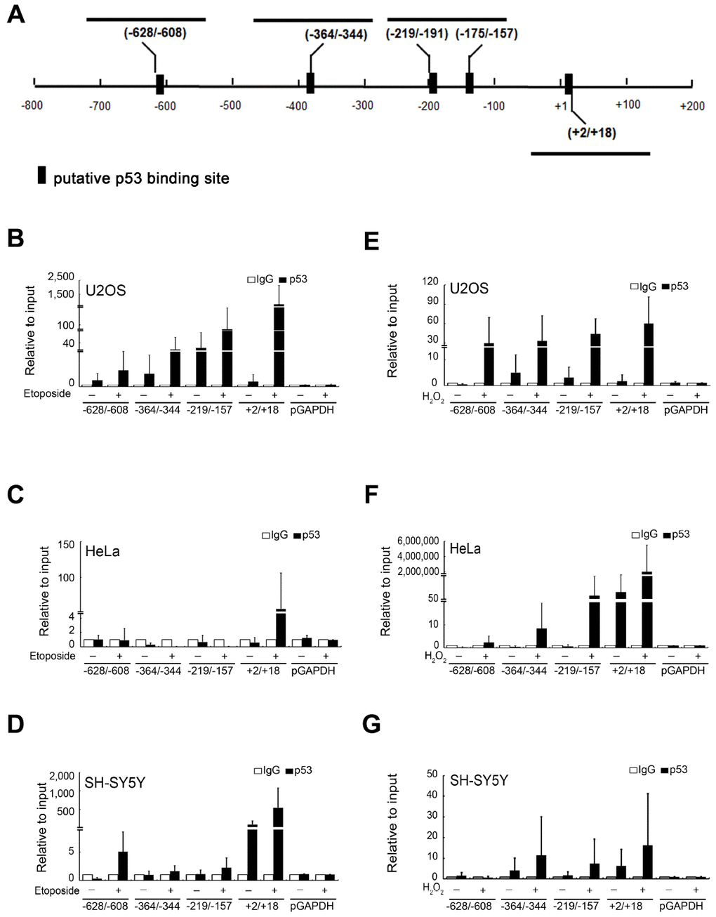 ChIP assays were performed as previously described [54]. Briefly, etoposide- or H2O2-treated U2OS, HeLa, and SH-SY5Y cells were harvested and cross-linked with 1% formaldehyde. The DNA-protein complex was precipitated by the p53 antibody (Santa Cruz, USA). The primers used to detect immunoprecipitated DNA are shown in Supplementary Table 1.