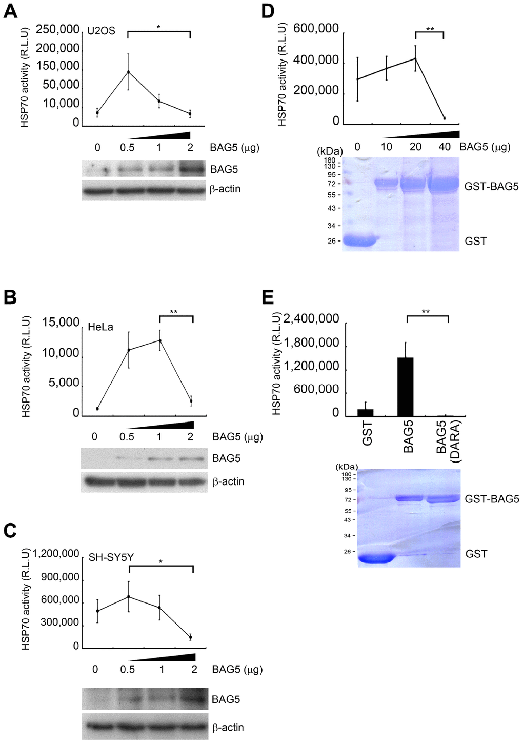 HSP70, a chaperone regulated by BAG5, folds naïve proteins for their maturation. A previous study has shown that purified BAG5 can function as a nucleotide exchange factor of HSP70 for HSP70-mediated protein refolding [16, 28]. To determine whether BAG5 modulates HSP70 chaperone activity in vivo, we examined HSP70 activity under different levels of BAG5 expression. Using a Human HSP70/HSP40 Protein Refolding Kit [29] to investigate the effect of BAG5 on HSP70 in cells, we found that the refolding activity of HSP70 on heat-denatured firefly luciferase was enhanced in the presence of a lower level of BAG5 in all three cells (Figure 4A–4C). However, the high-level of BAG5 reduced the HSP70 refolding activity. These data indicate that overexpressed BAG5 may lead to loss of its promoting ability for HSP70 chaperone. To examine whether the BAG5-mediated biphasic phenotype was directly contributed by BAG5 itself or by its posttranslational modifications and/or associated factors, we further examined the effect of the E. coli-expressed recombinant GST-BAG5 on the HSP70-mediated refolding activity. The in vitro HSP70-mediated refolding activity was enhanced by a lower amount of GST-BAG5 but repressed by a high concentration of GST-BAG5 (Figure 4D). Conversely, GST-BAG5 (DARA) with defective binding to the HSP70 ATPase domain [16] failed to promote the refolding reaction (Figure 4E). To compare the relative levels of BAG5 between plasmid-mediated overexpression and stress-induced overexpression in SH-SY5Y cells, we quantified the intensity of Western blots [30]. A linear regression test using different amounts of the BAG5 plasmid in SH-SY5Y cells was performed. The amounts of etoposide- and H2O2-induced BAG5 calculated by the linear regression equation were 1.46 and 1.44 μg, respectively (Supplementary Figures 7), which are within the range displaying repression of HSP70 activity (Figure 4C). Taken together, these results imply that the overexpressed BAG5 may result in the loss of its ability to promote HSP70.
