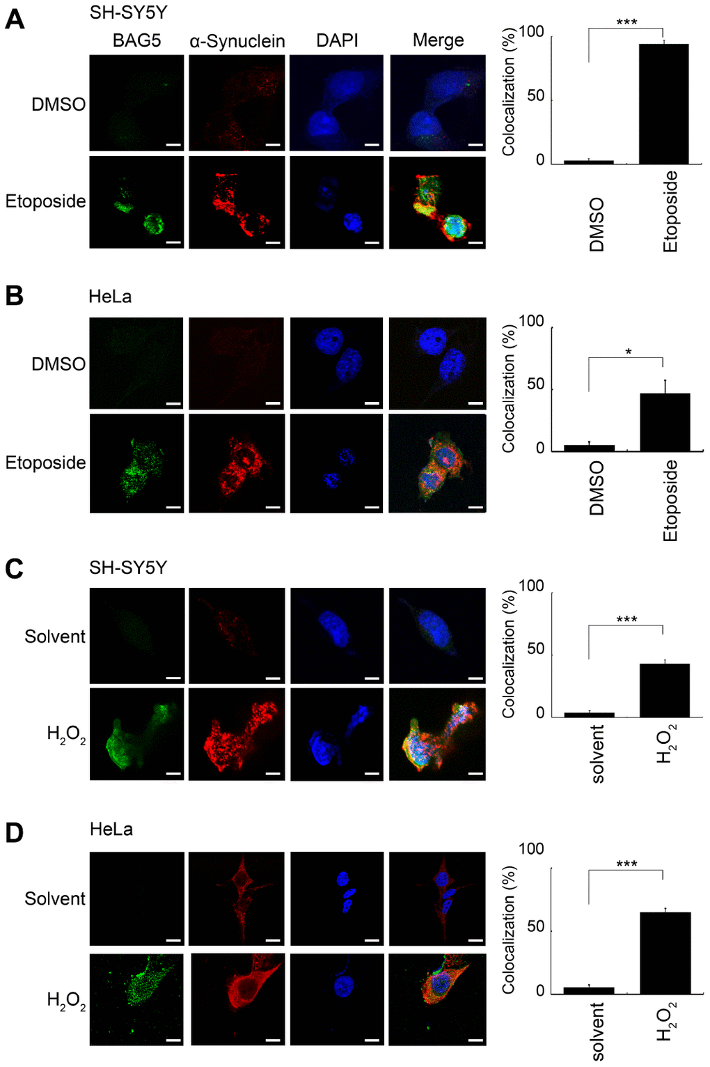Neuronal α-synuclein accumulation, which is a major component of LBs, is a central pathology of PD [1, 31]. Previous reports revealed that BAG5 expression is localized within dopaminergic neurons and LBs, which may colocalize with α-synuclein [16, 20]. To investigate the subcellular localization of stress-induced BAG5 and α-synuclein under cellular stresses, we visualized the intracellular distribution of the BAG5 and α-synuclein proteins in stress-induced HeLa and SH-SY5Y cells by confocal microscopy. As shown in Figure 5, compared to the solvent-treated control cells, BAG5 and α-synuclein were enriched in the majority of stress-exposed cells. Moreover, merged images indicated that BAG5 partially colocalizes with α-synuclein, especially at the perinuclear compartment, with some expression throughout the cytosol. Quantitative data showed that, after stress exposure, there are significant increases in the proportions of cells with BAG5 and α-synuclein colocalization (Figure 5, right panel).
