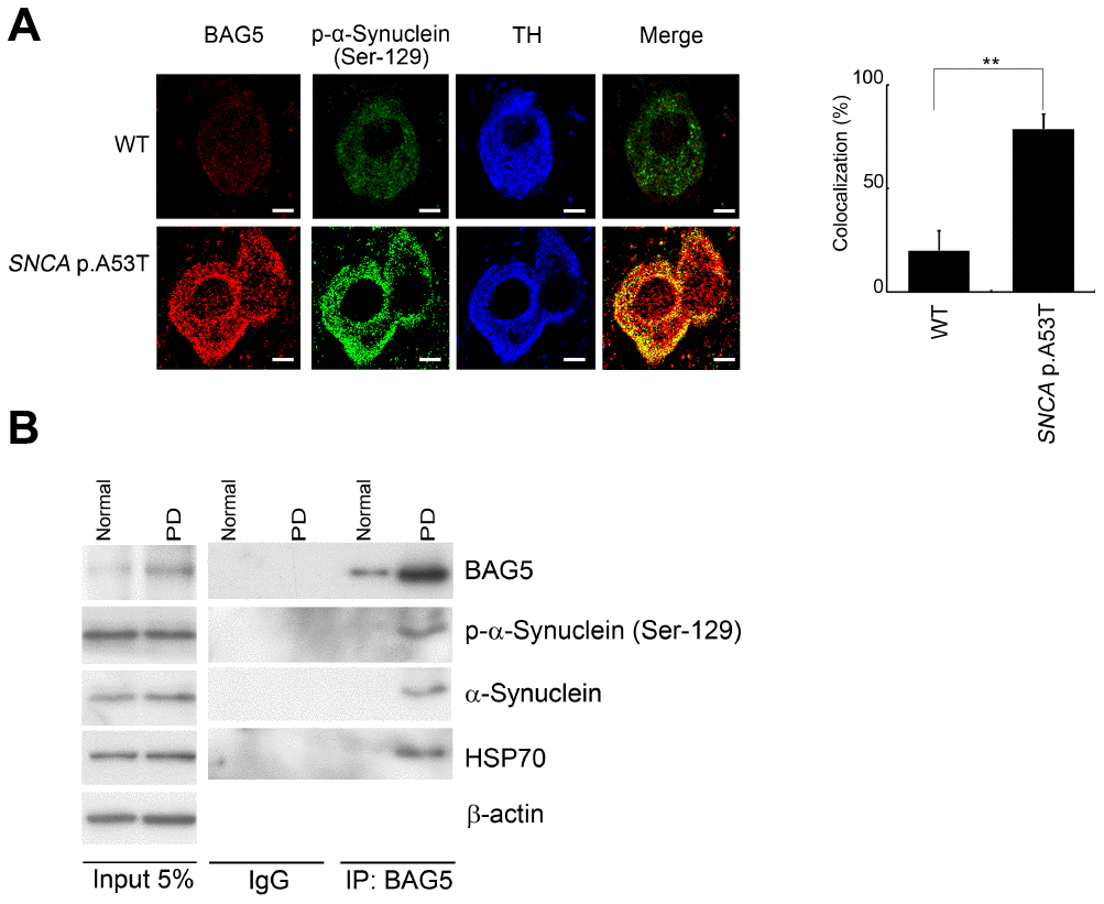 BAG5 expression and BAG5-α-synuclein association are increased in the brains of SNCA p.A53T mice and of human PD patient