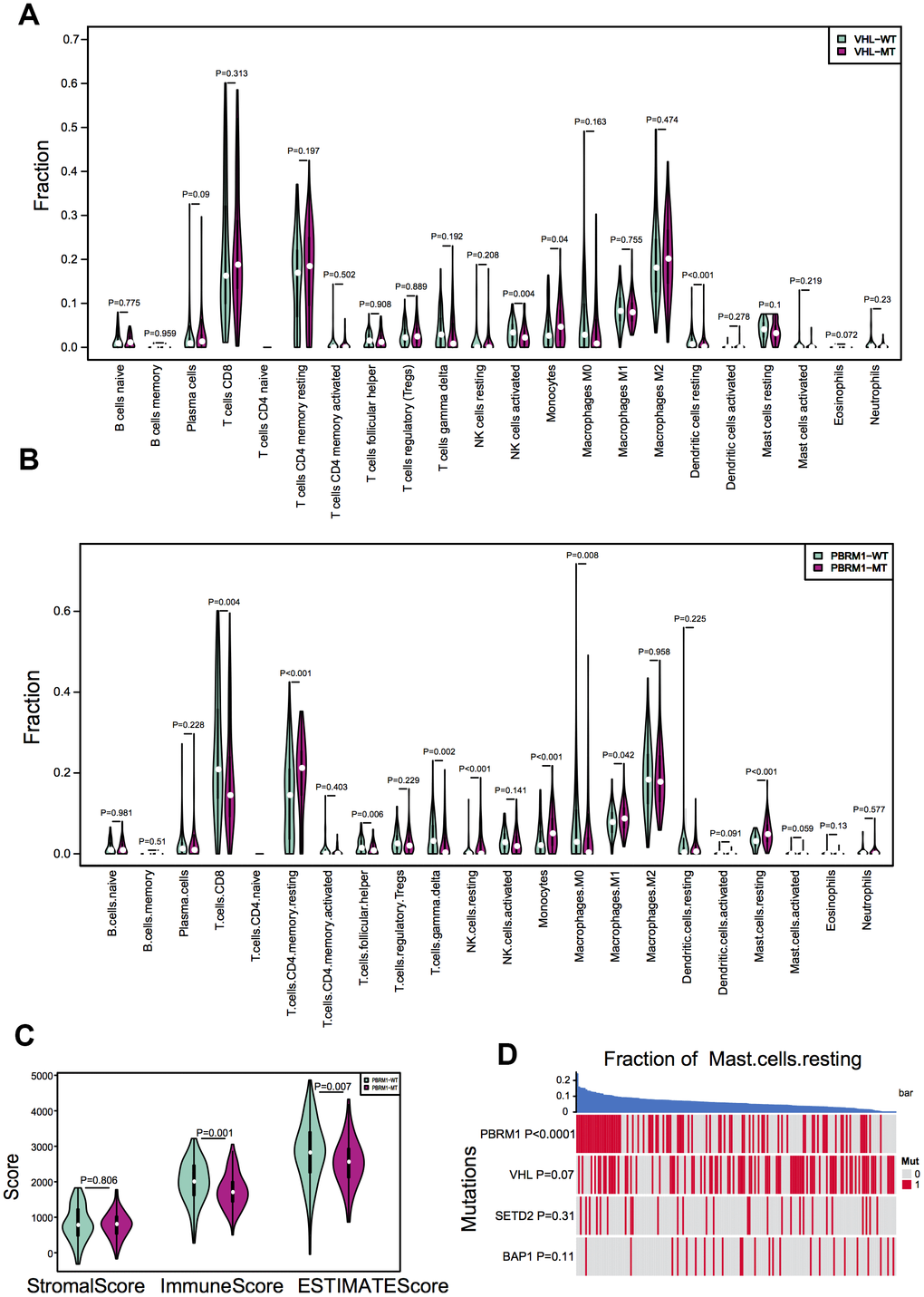 The comprehensive understanding of infiltrating stromal and immune cells in tumour tissue not only perturb the tumour signal in molecular studies but also have an important role in cancer biology [39]. We assessed infiltrating stromal and immune cells in tumor tissues to predict tumor purity in PBRM1MUT ccRCC patients. As shown in Figure 2C, the PBRM1MUT ccRCC patients showed significantly lower immune scores (P=0.001) and ESTIMATE scores (P=0.007) based on ESTIMATE algorithm analyses compared to PBRM1WT ccRCC patients. Furthermore, resting mast cell recruitment positively correlated with the PBRM1MUT genotype (P<0.0001), but showed no significant correlation with mutations in the VHL (P=0.0731), SETD2 (SET domain containing 2; P=0.306), and BAP1 (BRCA1 associated protein 1; P=0.106) genes (Figure 2D). These results demonstrate that tumor purity and recruitment of resting mast cells to the TME is significantly higher in PBRM1MUT ccRCC patients compared to PBRM1WT, VHLMUT, SETD2MUT and BAP1MUT ccRCC patients.