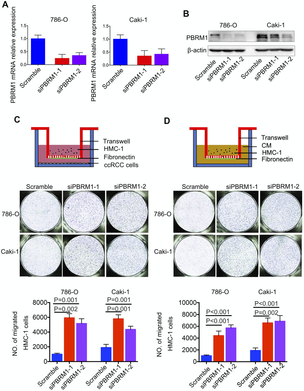 Next, we analyzed the association between PBRM1 protein levels and mast cell infiltration in ccRCC tumor samples. Immunohistochemical analysis (IHC) of 90 ccRCC and adjacent normal kidney tissues using anti-PBRM1 and anti-Tryptase (specific marker of mast cells) antibodies showed that PBRM1 protein expression was significantly reduced in the ccRCC tissues compared to the adjacent kidney tissues (Figure 4A, 4B, P<0.001). Moreover, as shown in Figure 4A, normal kidney tissues were PBRM1-positive and Tryptase-negative (no mast cells in normal tissue), whereas, ccRCC tumor tissues were PBRM1-negative and Tryptase-positive (high numbers of mast cells in the tumor). Furthermore, 65 out of 85 (76.4%) ccRCC patients that were PBRM1-negative showed worse overall survival than the remaining PBRM1-positive ccRCC patients (Figure 4C), however, there was no statistically significant between two groups (P=0.07). Moreover, tumor tissues from PBRM1-negative ccRCC patients showed significantly higher mast cell infiltration compared to those from PBRM1-positive ccRCC patients (Figure 4A, 4D). To confirm the effects of PBRM1 on mast cell recruitment, we performed an in vitro Transwell migration assays using 5×104 HMC-1 cells in the upper chamber and PBRM1-knockdown ccRCC cells (786-O and Caki-1, Figure 5A, 4B) or conditioned media from these cells in the lower chamber. The results of the co-culture Transwell migration assay showed that HMC-1 recruitment was significantly higher in PBRM1-silenced 786-O- (siPBRM1-1, P=0.003; siPBRM1-2, P=0.006) and PBRM1-silenced Caki-1 (siPBRM1-1, P=0.002; siPBRM1-2, P=0.004) cells compared to their corresponding siNC-transfected controls (Figure 5C). Furthermore, HMC-1 recruitment was significantly higher in conditioned media derived from the PBRM1-silenced 786-O (siPBRM1-1, P=0.007; siPBRM1-2, P=0.005) and PBRM1-silenced Caki-1 (siPBRM1-1, P=0.001; siPBRM1-2, P=0.001) cells compared to CM derived from siNC-transfected controls (Figure 5D). These data confirm that PBRM1 downregulation in ccRCC cells promotes recruitment of mast cells, both in vivo and in vitro.