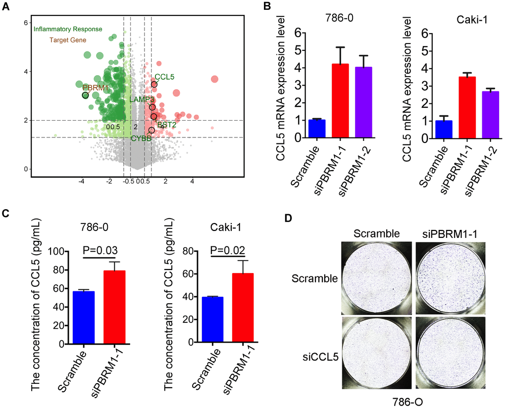 Total cellular RNA was isolated using the RNA Fast 200 kit (Feijie Biotech, Shanghai, China) according to manufacturer’s protocol. The cDNA synthesis was performed using Prime Script™ RT reagent kit (Takara Biotechnology Co. Ltd., Dalian, China) and subsequently, qPCR was performed using the SYBR Green PCR Master Mix (Takara Biotechnology Co. Ltd., Dalian, China). The relative expression of PBRM1 and CCL5 was calculated by the 2–ΔΔCt method [57]. GAPDH was used as the internal control. The primers used for qPCR are as follows: GAPDH forward: 5’-AT GGGGAAGGTGAAGGTCGG-3’; GAPDH reverse: 5’-GACGGTGCCATGGAAT TTGC-3’; PBRM1 forward: 5’-AGGAGGAGACTTTCCAATCTTCC-3’; PBRM1 reverse: 5’-CTTCGCTTTGGTGCCCTAATG-3’; CCL5 forward: 5’-CCAGCAGTCGTCTTTGTCAC-3’; CCL5 reverse: 5’-CTCTGGGTTGGCACACACTT-3’.