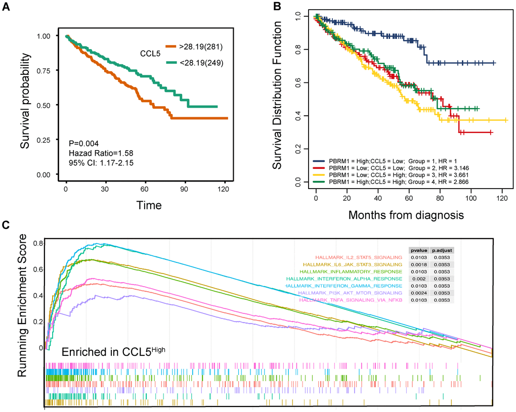 Next, we analyzed the relationship between CCL5 expression and ccRCC prognosis. Survival analysis showed that ccRCC patients with high CCL5 expression (CCL5High) were associated with worse survival outcomes than those with low CCL5 expression (CCL5Low; Figure 8A; P=0.004). Moreover, PBRM1High/CCL5Low ccRCC patients exhibited better overall survival than PBRM1High/CCL5High, PBRM1Low/CCL5High, and PBRM1Low/CCL5High ccRCC patients (Figure 8B). Furthermore, the hazard ratios (HR) of ccRCC patients with PBRM1High/CCL5High, PBRM1Low/CCL5High, and PBRM1Low/CCL5High were 2.866 (P<0.001), 3.661 (P<0.0001), and 3.146 (P<0.001) higher than the HR of ccRCC patients with PBRM1High/CCL5Low expression (Figure 8B). As shown in Figure 8C, CCL5high ccRCC patients showed significant enrichment in immune-related signaling pathways, including inflammatory signaling (P=0.0103), IFN-γ signaling (P=0.0103), IFN-α signaling (P=0.002), IL-6-JAK-STAT3 (P=0.0018), and TNF-α-NF-ΚB signaling (P=0.0103).