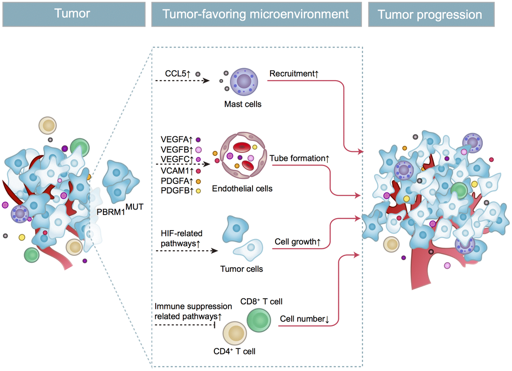 The TME includes fibroblasts, pericytes, endothelial cells, and immune cells such as T cells, mast cells, and macrophages [28–30]. Mast cells are one of the earliest cell types that infiltrate developing tumors [31]. They secrete several pro-angiogenic factors such as VEGF, basic fibroblast growth factor (bFGF), angiopoietin-1 (ANG-1), heparin, and tumor necrosis factor alpha or TNF-α [32]. They also secrete or express several chemokines and cytokines that modulate immune function such as interleukin 5 (IL-5), IL-6, MHC II (major histocompatibility complex, class II), and TNF-α [32, 33]. In ccRCC tissues, higher numbers of mast cells correlate with increased microvascular density [34–37]. Furthermore, mast cells, ccRCC cells, and endothelial cells interact via the SCF (stem cell factor)/c-Kit signaling pathway [38]. In ccRCC tissues, the status of VHL mutations do not correlate with the expression of immune cells [25], whereas, PBRM1 mutations are associated with T cell infiltration and immune-related gene expression [25]. However, the mechanistic details of the crosstalk between PBRM1 mutations in ccRCC cells, the tumor microenvironment, and immune cell infiltration and function is not clear.