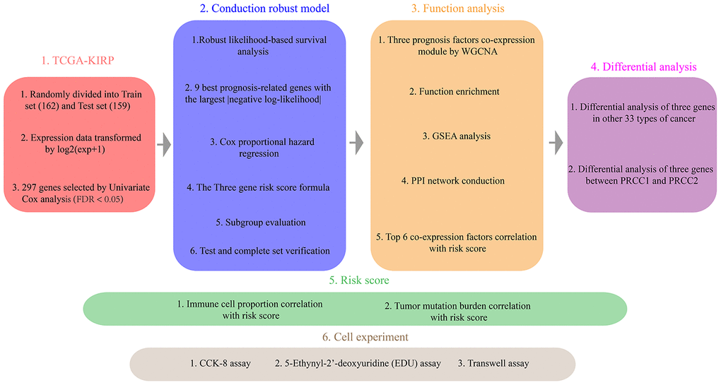 With the development of high-throughput sequencing technology, we obtained a disease expression matrix from open source databases. At present, the predictive model method acts as effective method to find the key prognosis factors. Cao et al. constructed a recurrence prediction model based on 17 prognosis-related protein coding genes [5]. Zhang et al. constructed a prognostic survival model based on 17 mutation genes [6]. Klatte et al. constructed a VENUSS prognostic model to predict disease recurrence for non-metastatic papillary renal cell carcinoma, which VENUSS contained four clinical indicators (VEnous extension, NUclear grade, Size, Stage) score [7]. Gao et al. constructed a prognostic score model composed of five protein-editing genes [8]. Lee et al. updated the Leibovich score to obtain more accurate results for mortality and prognosis of renal cell carcinoma [9]. These studies assessed prognostic status by establishing prognostic scoring systems and assigning risk scores to each patient. After external data verification, they achieved good predictive power. These findings suggest that it is critical to mine key prognostic factors to establishing prognostic prediction models.