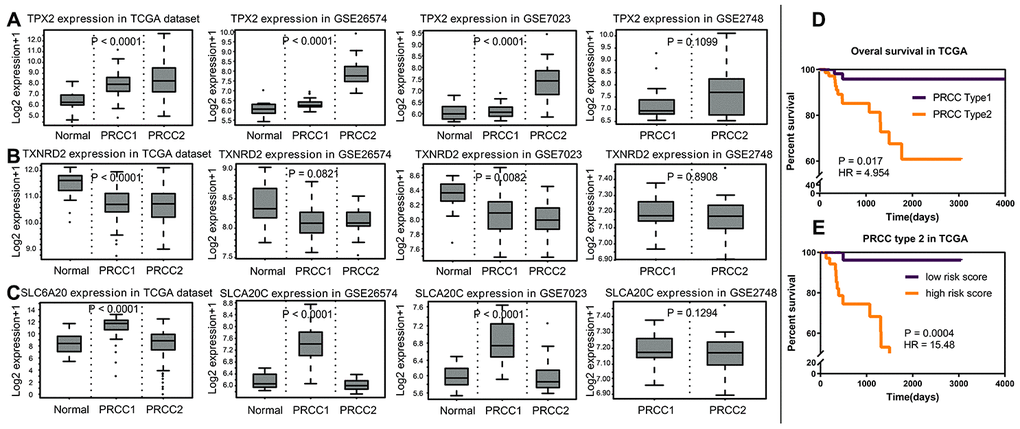 The expression differences of TPX2, TXNRD2 and SLC6A20 in 33 cancers in TCGA are shown in Figure 9. TPX2 was upregulated in kidney chromophobe (P < 0.001), kidney renal clear cell carcinoma (P < 0.001), and kidney renal papillary cell carcinoma compared to normal tissue. TXNRD2 was downregulated in kidney chromophobe (P < 0.001), kidney renal clear cell carcinoma (P < 0.001), and kidney renal papillary cell carcinoma compared to normal tissue. The results of TPX2 and TXNRD2 differential expression analysis were consistent with their effect on patient prognosis. However, SLC6A20 was downregulated in kidney chromophobe (P < 0.001), kidney renal clear cell carcinoma (P < 0.001), but upregulated in kidney renal papillary cell carcinoma compared to normal tissue. SLC6A20 acted as a protective prognostic factor and should be downregulated in the tumor group; however, in TCGA, the result was the opposite. To explain this result, we analyzed the differential expression of TPX2, TXNRD2 and SLC6A20 in PRCC type 1 and PRCC type 2. We found that TPX2 was upregulated significantly in the PRCC type 2 group (Figure 10A), TXNRD2 and SLC6A20 downregulated significantly in the PRCC type 2 group (Figure 10B, 10C). PRCC type 2 gave worse outcomes than did PRCC type 1 (Figure 10D, 10E). These findings suggest that SLC6A20 is downregulated significantly in PRCC2 compared to PRCC1, and that SLC6A20 acts as a prognostic protective factor.