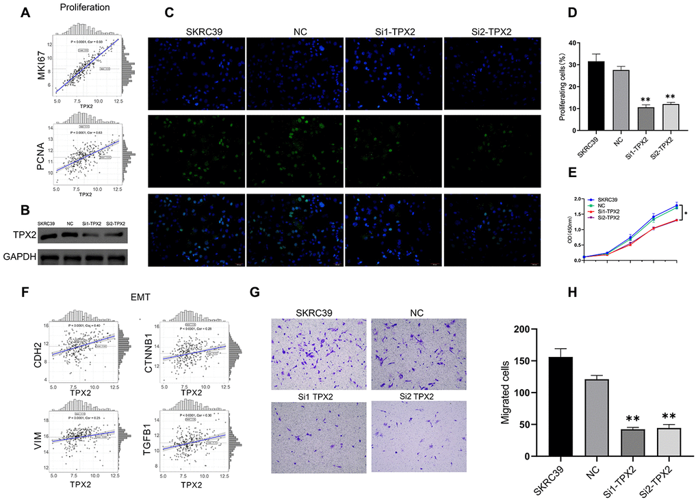 TPX2 is overexpressed in papillary renal cell carcinoma and is related to poor prognosis. In PRCC cell line, the role of TPX2 was determined in vitro experiments. First of all, TPX2 showed positively correlation to MKI67 and PCNA in TCGA (Figure 11A). Small interfering RNAs was used to reduce expression levels of TPX2 in the papillary renal cell carcinoma cell line SKRC39 (Figure 11A) and the TPX2 protein expression level were shown in Figure 11B. EdU incorporation assays were used to determine the effects of TPX2 on SKRC39 cell proliferation. EdU assay suggested that TPX2 inhibits PRCC cell lines proliferation capacity (Figure 11C and 11D). The effects of TPX2 on the proliferation of SKRC39 cells were analyzed by CCK-8 assays. The results are presented as the mean ± SD of three independent experiments (*P < 0.05, **P < 0.01) (Figure 11E). Afterwards, TPX2 showed positively correlation to CDH2, CTNNB1, VIM and TGFB1 in TCGA (Figure 11F). The results of transwell assays showed that Knockdown of TPX2 inhibited cell migration (Figure 11G and 11H).