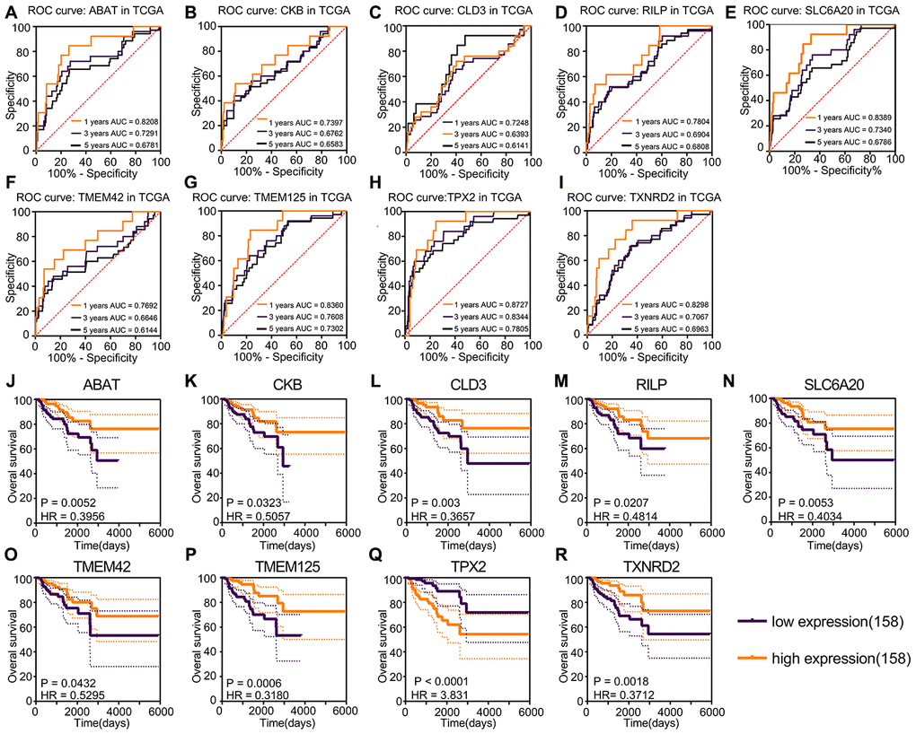 A total of 1547 protein-coding genes were noise-reduced using false discovery rate (FDR); 297 prognosis genes were identified using FDR < 0.05. Nine prognosis genes were selected robustly using the “rbsurv” package based on these 297 prognosis genes. The univariate Cox regression P-value and FDR of the nine robust genes are shown in Table 1. The Akaike information criterion and negative log-likelihood of these nine genes are shown in Table 2. The survival analysis and ROC curves showed that TPX2 was a risk factor, and that ABAT, CKB, CLD3, RILP, SLC6A20, TMEM42, TMEM125, TXNRD2 were protective factors (Figure 2A–2R). TPX2 was the only risk factor closely related to prognostic status (HR = 3.831; P < 0.0001) and had the ability to determine prognosis (1-year AUC = 0.8727; 3-year AUC = 0.7805; 5-year AUC = 0.7805).