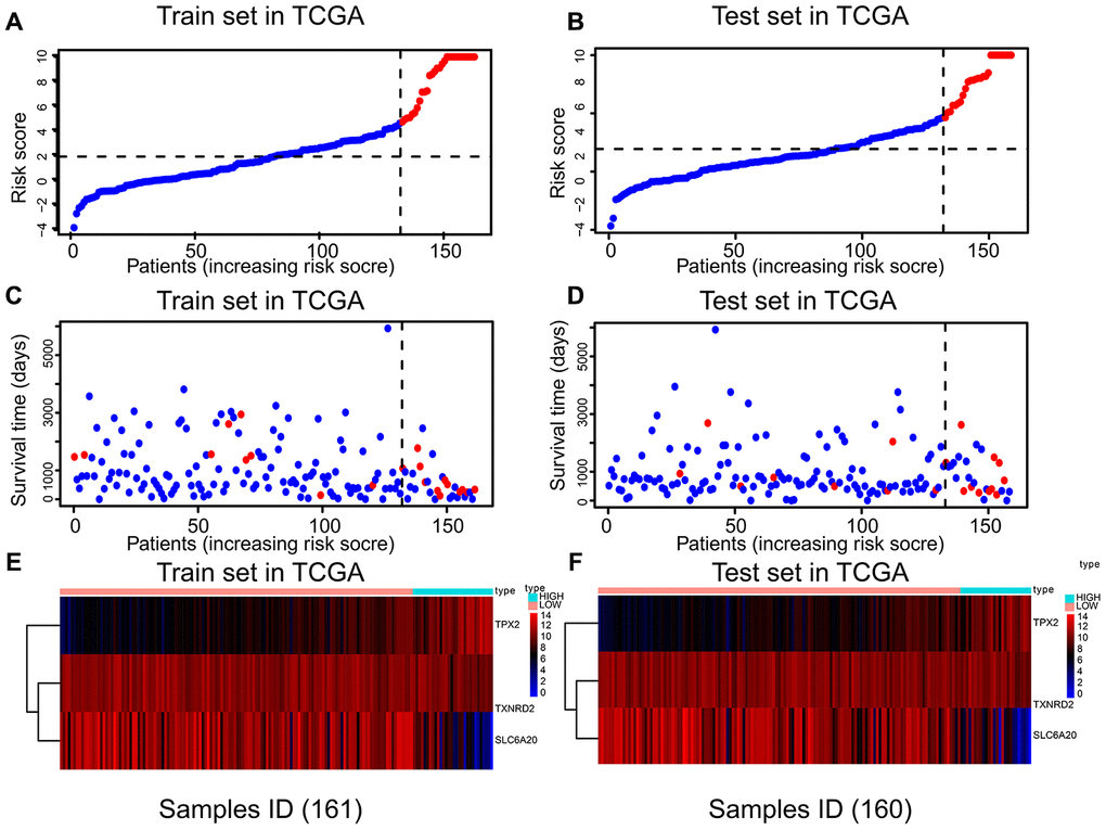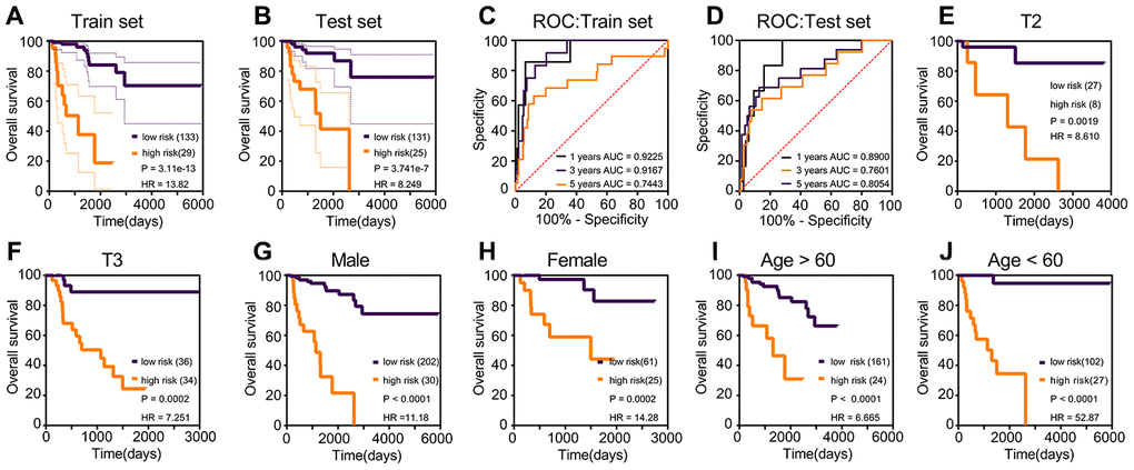 Risk scores were established using multivariate Cox regression (Table 3), based on the nine prognostic genes selected robustly. Risk score = 1.806 * TPX2 - 0.355 * TXNRD2 - 0.805 * SLC6A20. The optimal threshold score with the maximal sensitivity and specificity was 4.6846. The risk scores, survival statuses and gene expression levels corresponding to each sample are displayed in Figure 3A–3E. We found that patients in the high-risk score group had worse prognosis, and expression levels of TPX2 were higher than those in the low-expression group. The risk score K–M analysis (P = 3.11e-13; HR = 13.82) and AUC (1-year = 0.9225; 3-year = 0.9167; 5-year = 0.7443) in the training set were consistent with the results of risk score on K–M analysis (P = 3.741e-7; HR = 8.249) and AUC (1-year = 0.890; 3-year = 0.7601; 5-year = 0.8054) in the test set (Figure 4A–4D). Subsequently, we evaluated the prognostic ability of risk score in the various subgroups of TCGA, and found that the risk score had important prognostic value in the subgroups such as T2, T3, gender, and age (Figure 4E–4H).