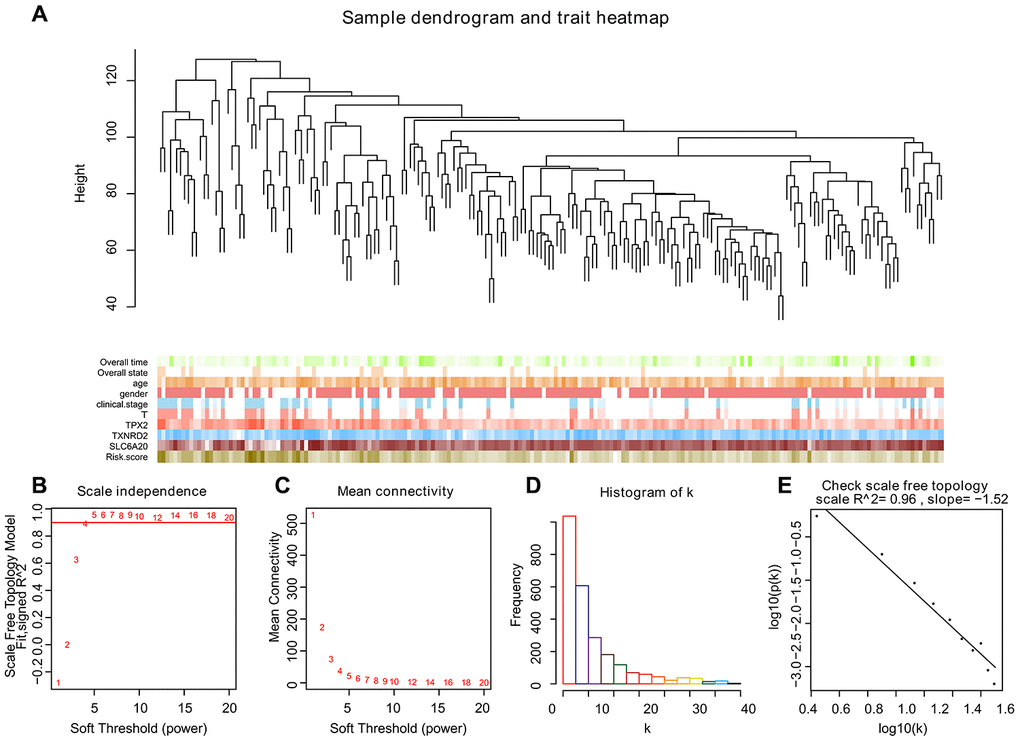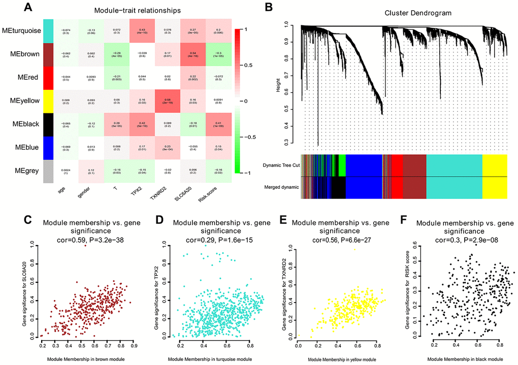 To create co-expression networks of TPX2, TXNRD2, SLC206A and risk score, we selected the cutoff point of 130 and obtained 198 clinical samples. A sample cluster map and phenotype-related heat map were constructed (Figure 5A). We set the soft threshold as 5 (Figure 5B, 5C), R square = 0.96 (Figure 5D, 5E), and established a scale-free network. We set the number of genes in the minimum module as 30, abline as 0.25. We drew correlation heat maps for modules and genes (Figure 6A). The hierarchical clustering tree is shown in Figure 6B, where each leaf on the tree represents a gene, and each branch represents a co-expression module. We found that the brown module has the strongest positive correlation with SLC6A20 (Pearson Cor = 0.59; P = 3.2e-8) (Figure 6C). The turquoise module had the strongest positive correlation with TPX2 (Pearson Cor = 0.29; P = 1.6e-15) (Figure 6D), the yellow module had the strongest positive correlation with TXNRD2 (Pearson Cor = 0.56; P = 6.6e-27) (Figure 6E) and the black module had the strongest positive correlation with risk score (Pearson Cor = 0.30; P = 2.9e-8) (Figure 6F). The correlation between co-expression factors and risk score are shown in Supplementary Figure 2.