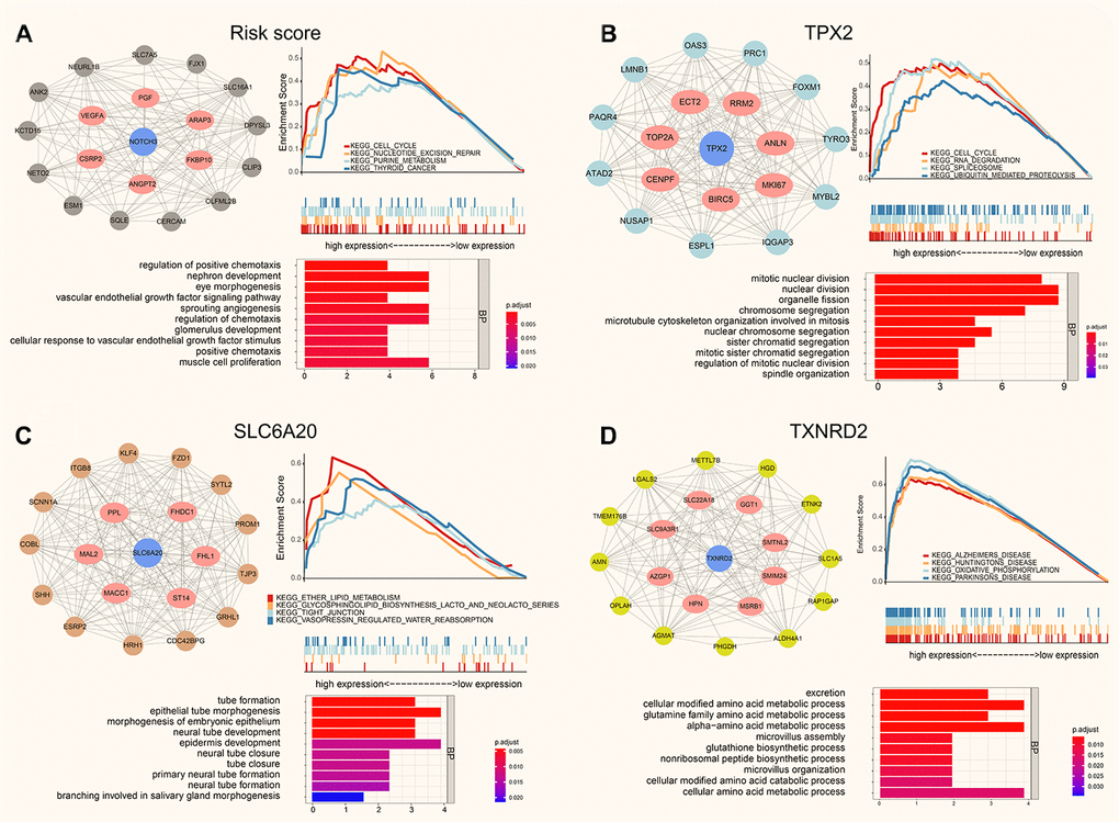 Using WGCNA, we obtained the co-expression modules of TPX2, TXNRD2, SLC6A20 and risk score, the PPI (protein-protein interaction network), Function analysis and GSEA of them are shown in Figure 7. GO analysis showed that the top 20 co-expression genes of risk score were significantly enriched in regulation of positive chemotaxis, nephron development, and sprouting angiogenesis. GSEA analysis of risk score showed that cell cycle, nucleotide excision repair and purine metabolism were related to the high expression group (Figure 7A). GO analysis showed that the top 20 co-expression genes of TPX2 were significantly enriched in mitotic nuclear division, nuclear division, chromosome segregation. GSEA analysis of TPX2 showed that cell cycle, RNA degradation and spliceosome were related to the high expression group of TPX2 (Figure 7B). GO analysis showed that the top 20 co-expression genes of SLC6A20 were significantly enriched in tube formation, epithelial tube morphogenesis, and neural tube development. GSEA analysis of SLC6A20 showed that ether lipid metabolism, tight junction, and vasopressin regulated water reabsorption were related to the high expression group of SLC6A20 (Figure 7C). GO analysis showed that the top 20 co-expression genes of TXNRD2 were significantly enriched in excretion, cellular modified amino acid metabolic process, and glutamine family amino acid metabolic process. GSEA analysis of TXNRD2 showed that Alzheimer disease, Huntington disease, Parkinson disease were related to the high expression group of TXNRD2 (Figure 7D).