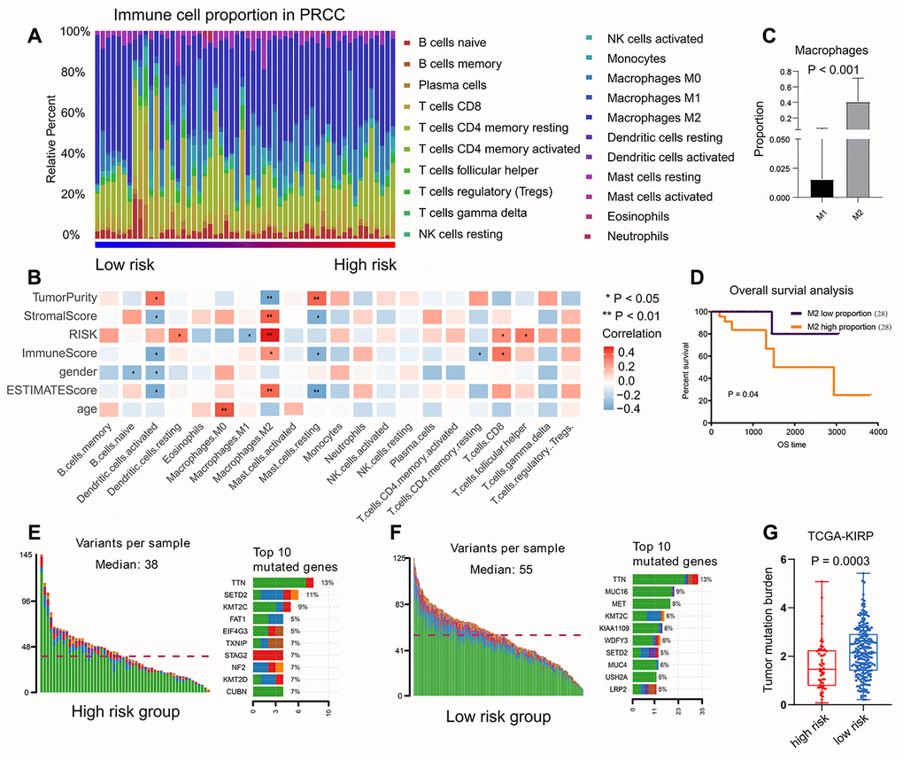 We first evaluated the variation in each TCGA-KIRP sample. the results showed that somatic mutations of TTN (P < 0.001) were greater in number both in low-risk group and high-risk group (Figure 8E, 8F). Patients with low risk scores had higher TMB value, suggesting that patients had better results in terms of immune responses and had better outcomes (Figure 8G).