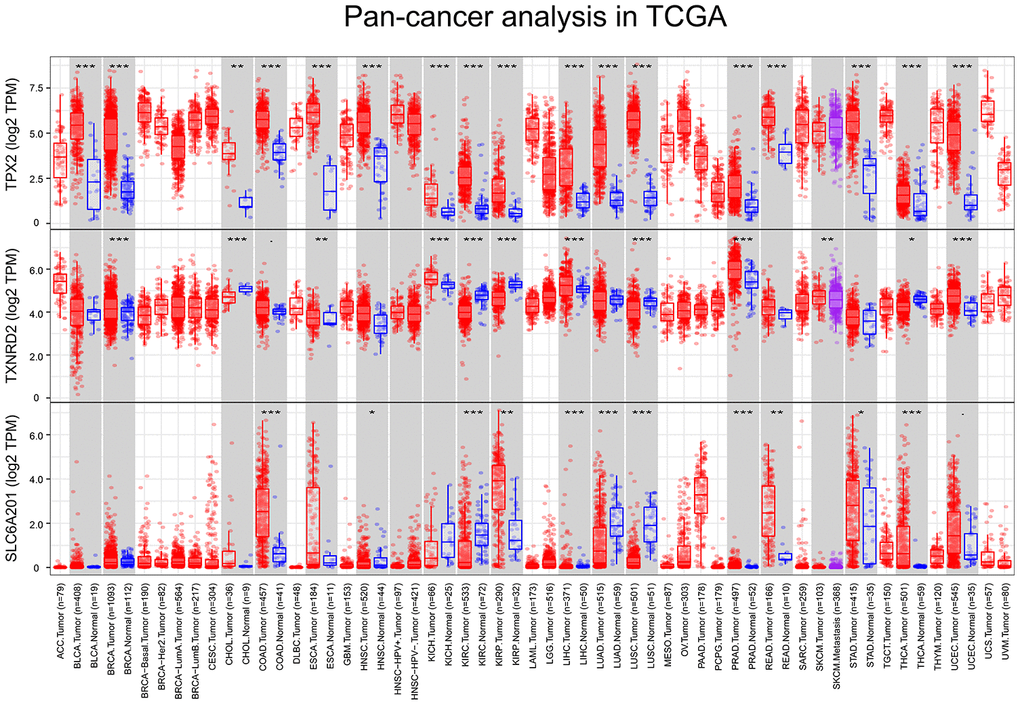 The Tumor Immune Estimation Resource (TIMER; https://cistrome.shinyapps.io/timer/) [43] was used to analyze the difference expression of TPX2, TXNRD2 and SLC6A20 between normal tissue and cancer in 33 cancer types.