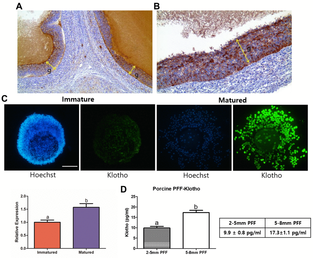 The function of the Klotho gene was first discovered in 1997, when a Klotho-mutated mouse showed an extreme decrease in lifespan [1]. Klotho mutations have since been identified as causing numerous symptoms, including hypogonadism, neurodegeneration, and hearing loss [2]. Additionally, Klotho is found to upregulate cell-surface abundance of calcium channel protein in human kidney cells [3], enhances cognitive ability of mouse brain [4], and suppress autophosphorylation of IGF receptors, which is associated with tumor progression [5]. However, Klotho has alternately been suggested to be involved in porcine in vitro production (IVP). Lee et al. found that overexpression of Klotho in porcine fibroblasts significantly improved the development of cloned porcine embryos [6]. Moreover, several studies have also suggested that Klotho is involved in antioxidant mechanisms. One study demonstrated that the Nrf2-mediated antioxidant mechanism can be induced by the Klotho hormone [7]. Likewise, in the state of oxidative stress, Klotho protein (KP) downregulates PI3K/AKT signaling and enhances the expression of manganese superoxide dismutase for antioxidation [8].