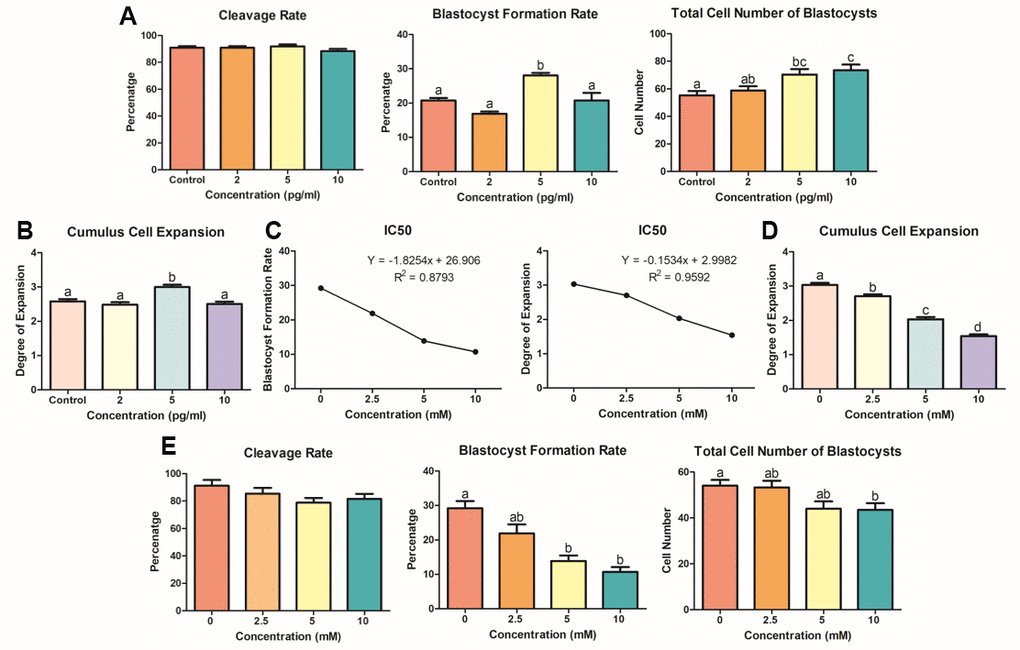 Oocytes exhibiting cumulus expansion were evaluated. The degree of cumulus expansion was determined by the morphology of the COCs, following the method described previously [48]. COCs exhibiting no expansion were classified as degree 0, as they were characterized by a complete detachment of cumulus cells (CCs) from oocytes. A classification of degree 1 indicated COCs with spherical and compact CCs that were not expanded, while COCs were classified as degree 2 if only the outermost layers of the CCs were expanded. A classification of degree 3 was likewise given to COCs which showed expansion in all layers of the CCs except for the corona radiata, while COCs which showed full expansion in all layers including the corona radiata were classified as degree 4.