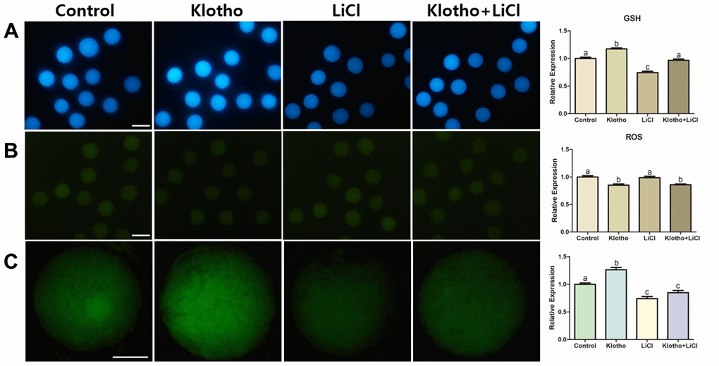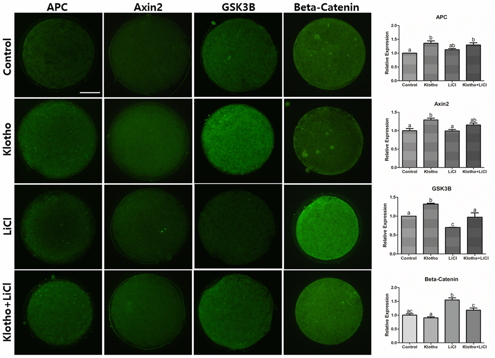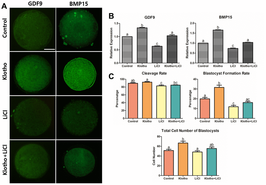 Mature oocytes showing the first polar body were selected and washed in PBS, then fixed in 4% paraformaldehyde (w/v) in PBS for at least 1 h. Permeabilization was performed by treating the cells with 1% Triton X-100 (v/v) in distilled water for 1 h at 39°C, washing four times in 1% PVA, and then incubating in 2% BSA for 2 h to block non-specific sites. The oocytes were then transferred directly into 2% BSA containing the primary antibody for Klotho (1:200; ab98111, Abcam), BMP15 (1:200; PA5–34401, Thermo Fisher Scientific), as well as GDF9 (1:200; ab93892, Abcam), APC (1:400; ab72040, Abcam), AXIN2 (1:100; ab109307, Abcam), GSK3B (1:100; ab227208, Abcam), and β-Catenin (1:200; ab16051, Abcam). The oocytes with antibodies were incubated at 4°C overnight. Following incubation, the oocytes were washed four times in 1% PVA droplets, and then incubated with a secondary fluorescein isothiocyanate-conjugated anti-rabbit polyclonal antibody (1:200, ab6717, Abcam. Cambridge, UK) at 37°C for 2 h in darkness. After washing with 1% PVA, the oocytes were then counterstained with 5 μg/mL Hoechst-33342 for 5 min. They were mounted on glass slides with cover glasses, and sealed with transparent manicure. The fluorescence measurements were performed using ImageJ (version 1.46r; National Institute of Health, USA). At least 30 oocytes from each treatment group (Control, KP, LiCl, and KP/LiCl cotreatment) were used for the analysis.