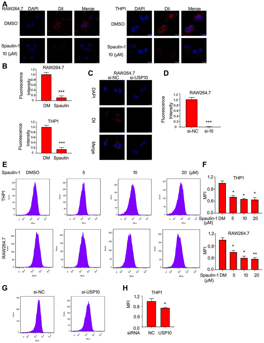 It has been reported that lipid intake is the first step in development of AS. Lipid is ingested by macrophage differentiated from monocyte. To detect the role of USP10 in lipid intake by macrophage, we used the oxLDL labeled by fluorescent dye Dil. The confocal assay demonstrated that USP10 inhibition induced fluorescent intensity, indicating that USP10 inhibitor (Spautin-1) reduced lipid uptake by THP1 and RAW264.7 cells (Figure 1A, 1B). In addition to inhibitor, we applied siRNA to further explore the function of USP10. Delightfully, USP10 deletion significantly decreased the lipid uptake in RAW264.7 cells (Figure 1C, 1D). Moreover, we also applied flow cytometry assay to demonstrate the ability of USP10 for lipid uptake. We found that Spautin-1 remarkably inhibited oxLDL uptake by macrophages (Figure 1E, 1F). The USP10 siRNA also blocked THP1 cells to intake oxLDL labeled by fluorescent dye Dil (Figure 1G, 1H).