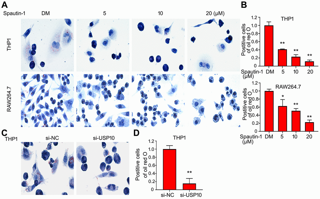 Given that USP10 inhibitor or siRNA significantly reduced Dil-oxLDL uptake by macrophages, we speculated whether foam cell formation is influenced by USP10. Firstly, we used oxLDL to incubate cell in THP1 and RAW264.7 cells. Oil red O assay showed that stained cell number was decreased in the treatment of USP10 inhibitor, suggesting that inhibition of USP10 blocks the foam cell formation in THP1 and RAW264.7 cells (Figure 2A, 2B). What is more, USP10 siRNA was applied. As shown in Figure 2C, 2D, knockdown of USP10 induced the same results using oil red O assay. These results demonstrated that USP10 involved in the formation of foam cell.