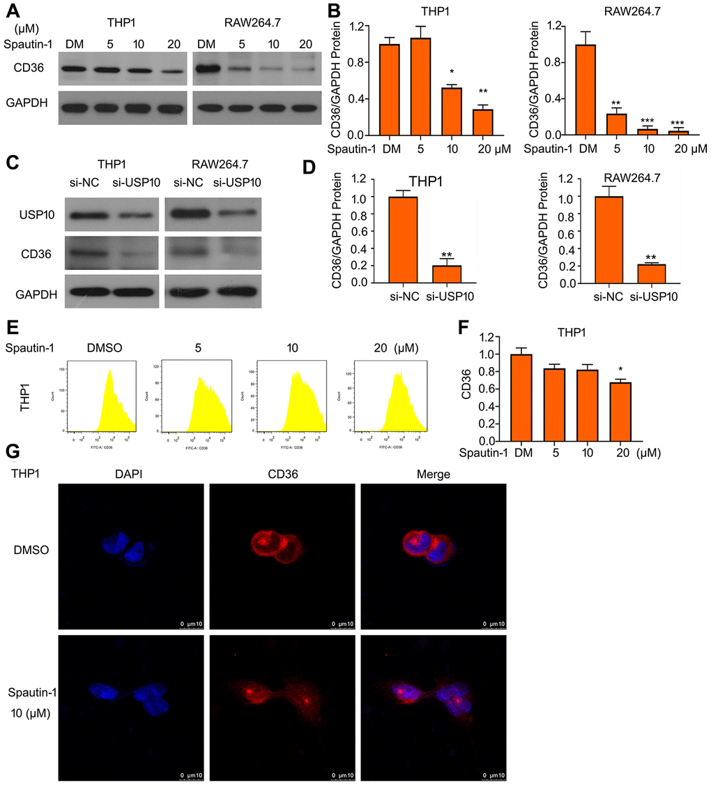 CD36 represents a vital function in progression of AS through mediating lipid intake by macrophage. We have clarified that USP10 inhibition suppresses lipid uptake. To further explore the regulatory mechanism of USP10, we tested the molecular expression under treatment of USP10. Interestingly, western blotting showed that Spautin-1 downregulated the protein expression of CD36 in THP1 and RAW264.7 cells (Figure 3A, 3B). USP10 knockdown also inhibited the expression of CD36 protein (Figure 3C, 3D). To further conformed USP10 induced-lipid uptake just depends on CD36, we evaluated other scavengers expressions (SR-B1, SR-A, Lox-1, ABCA1 and ABCG1). Western blot assay was used and the results showed that protein expressions are not regulated by UP10 inhibitor and siRNA (Supplementary Figure 1A, 1B). To ensure the effect of USP10 on CD36 expression, we used FITC-labeled CD36 antibody to perform flow cytometry assay. We found that USP10 inhibitor significantly reduced CD36 expression (Figure 3E, 3F). Moreover, we further observed CD36 location after the treatment of USP10 inhibitor. The confocal assay showed that CD36 is a membrane protein and USP10 changed the expression but not affect the translocation of CD36 protein (Figure 3G).