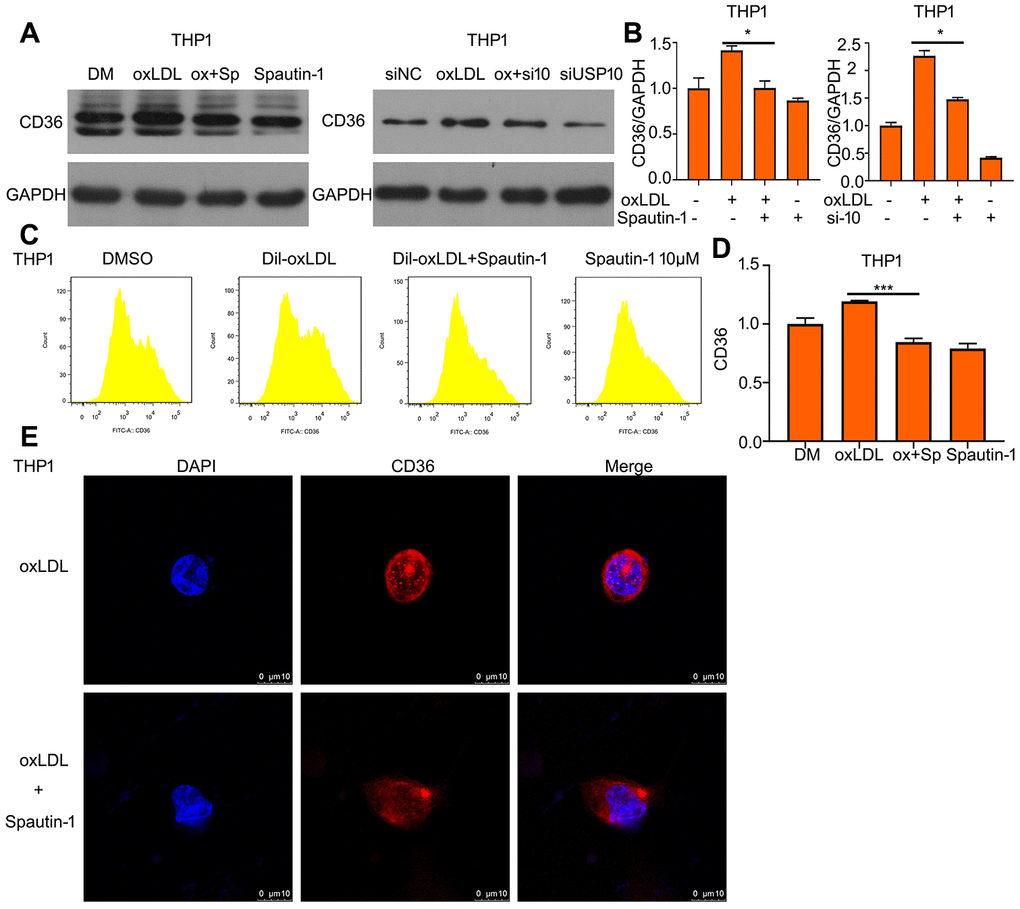 As known, it is a positive loop between oxLDL and CD36 expression. Lipid uptake can be upregulated by increasing CD36 expression and CD36 expression can be increased by oxLDL stimulation. Therefore, we assessed whether USP10 also regulated the protein expression of CD36 under oxLDL treatment. Western blot showed that increased expression of CD36 protein was suppressed by USP10 inhibitor or siRNA (Figure 4A, 4B). Using FITC-labeled CD36 antibody demonstrated that Spautin-1 significantly reduced oxLDL-induced increased CD36 expression (Figure 4C, 4D). CD36 location also was observed after the oxLDL + Spautin-1. We found that USP10 inhibition decreased the expression of CD36 in THP1 cells (Figure 4E).