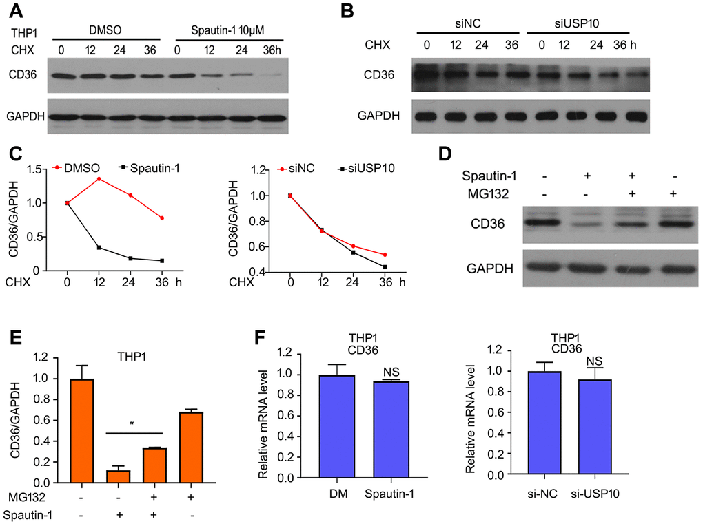 To better understand the role of USP10 on expression of CD36 protein, we sought to explore how USP10 stabilizes CD36 expression. We speculate whether the regulation is happen in the transcription level. Firstly, we used cycloheximide (CHX) to block protein synthesis. We found that the half-life period is shorter in the treatment of Spautin-1/USP10 siRNA and CHX than in the treatment of CHX in THP1 cells (Figure 5A–5C). Considering that CD36 is degraded by UPS, we used MG132 which blocking 20S proteasome activity to observe the protein expression of CD36. Western blot assay showed that blocking 20S proteasome activity abrogated the inhibition of CD36 expression induced by Spautin-1 (Figure 5D, 5E). In addition to transcription level, we also explore the translation level. The result of RT-qPCR showed that mRNA level of CD36 has no effect by USP10 inhibition or knockdown (Figure 5F). The results suggested that USP10 regulated CD36 expression via transcription method rather than translation method.