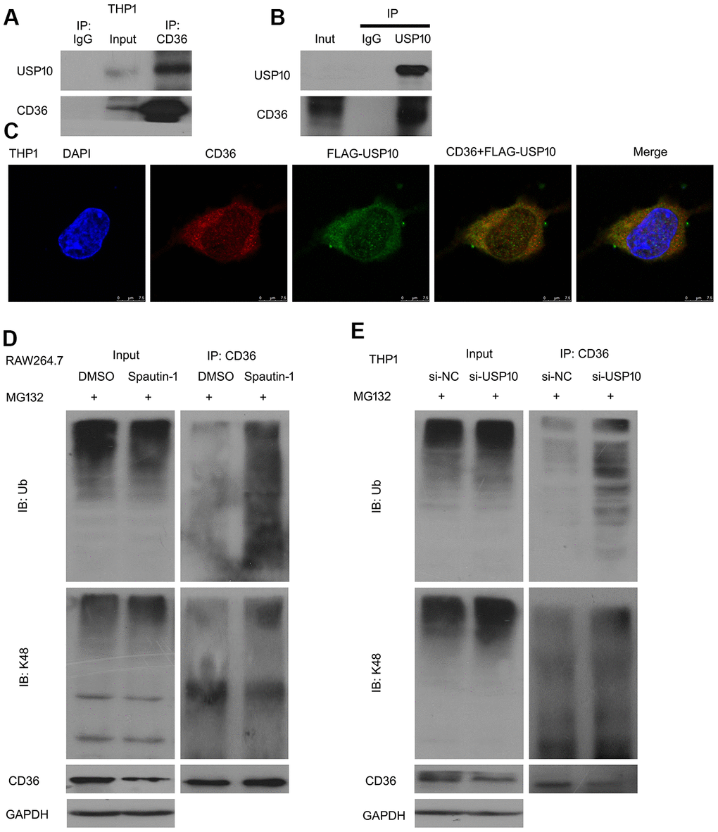 Deeply, we sought to the regulation mechanism of CD36-USP10 in macrophages. Transcription and translation levels are contribute to protein expression. In transcription aspect, we explore the mRNA level of CD36. USP10 did not change the mRNA level of CD36. Then in translation level, we found that USP10 inhibitor promoted the degradation of CD36 and the MG132 which blocking 20S rescued the protein expression of CD36. Based on this, we assessed that USP10 regulated CD36 via UPS. Co-IP and confocal assays revealed that CD36 interacts USP10 and the co-localization of CD36 and USP10. Under treatment of USP10 deletion, the poly- and poly-K48 ubiquitin on CD36 were increased, suggesting USP10 stabilizes CD36 protein by removing its ubiquitin.