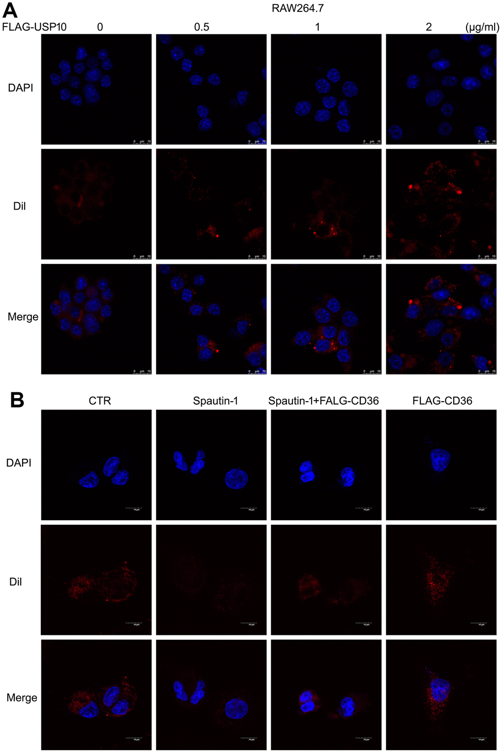 We have studied what silencing USP10 induced the inhibition of lipid uptake and CD36 expression. To further verify whether USP10 mediates lipid uptake by macrophage, we overexpressed USP10 to evaluate lipid uptake using Dil-oxLDL. Conversely, the result of fluorescence intensity showed that overexpression of USP10 increased lipid uptake (Figure 7A). Moreover, given that USP10 regulated CD36 expression, we determine if re-introduction of CD36 would rescue the lipid uptake inhibition induced by USP10 inhibitor. To do so, THP1 cells were transfected with FLAG-CD36 plasmid or a control vector, followed by Spautin-1. Overexpression of CD36 was able to rescue USP10 inhibition-induced lipid intake (Figure 7B). These results suggested that CD36 is indispensable for USP10-meidiated lipid uptake by macrophage.