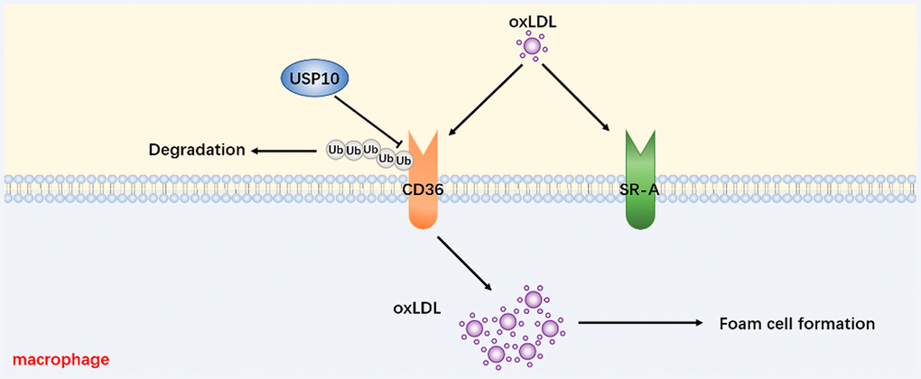 In summary, we have uncovered the function of USP10 on foam cell formation via regulating CD36 protein degradation (Figure 8). The present study also has investigated that USP10 is a DUB of CD36 and as a potentially practicable scheme for AS.